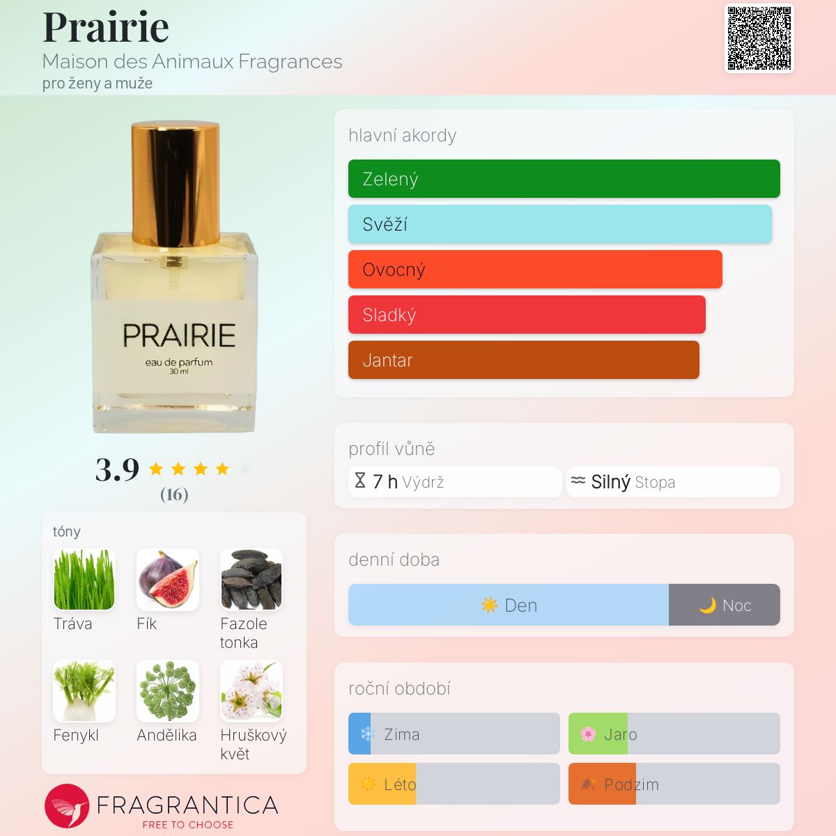 Prairie podle Maison des Animaux Fragrances je vůně pro ženy a muže. Toto je nová vůně. Prairie byl/a uveden/a v roce 2025. Vrchní tóny jsou Fík, Fenykl a Hruškový květ; základní tóny jsou Tráva, Fazole tonka a Andělika.