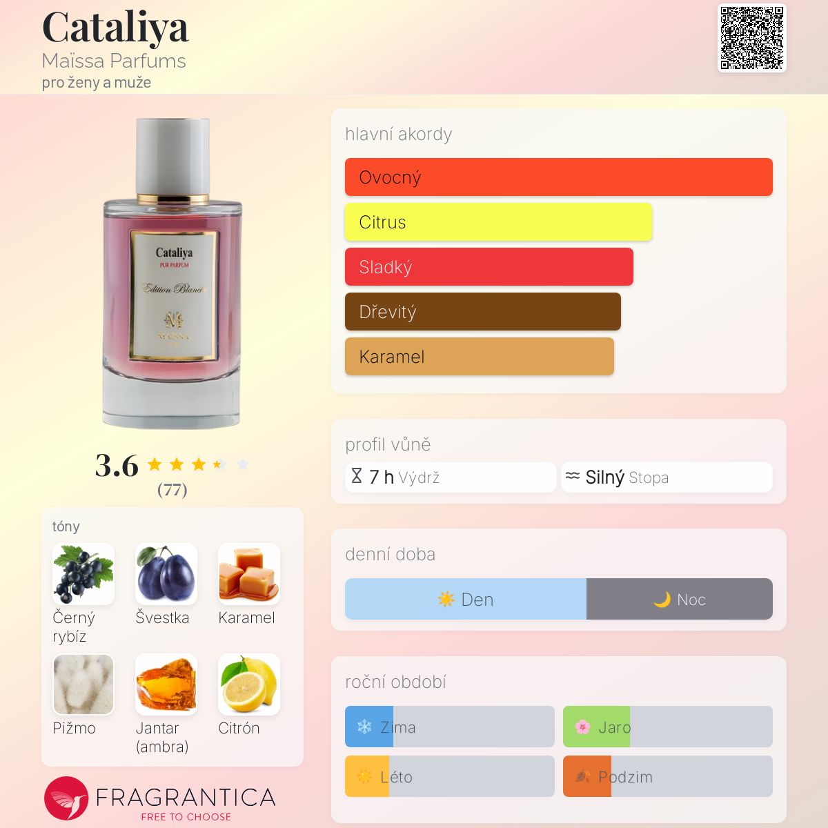 Cataliya podle Maïssa Parfums je Orientální vůně pro ženy a muže. Cataliya byl/a uveden/a v roce 2020. Vrchní tóny jsou Černý rybíz, Švestka, Citrón a Grapefruit; střední tóny jsouKaramel, Pačuli a Vetiver ; základní tóny jsou Pižmo, Jantar (ambra) a Vanilka.