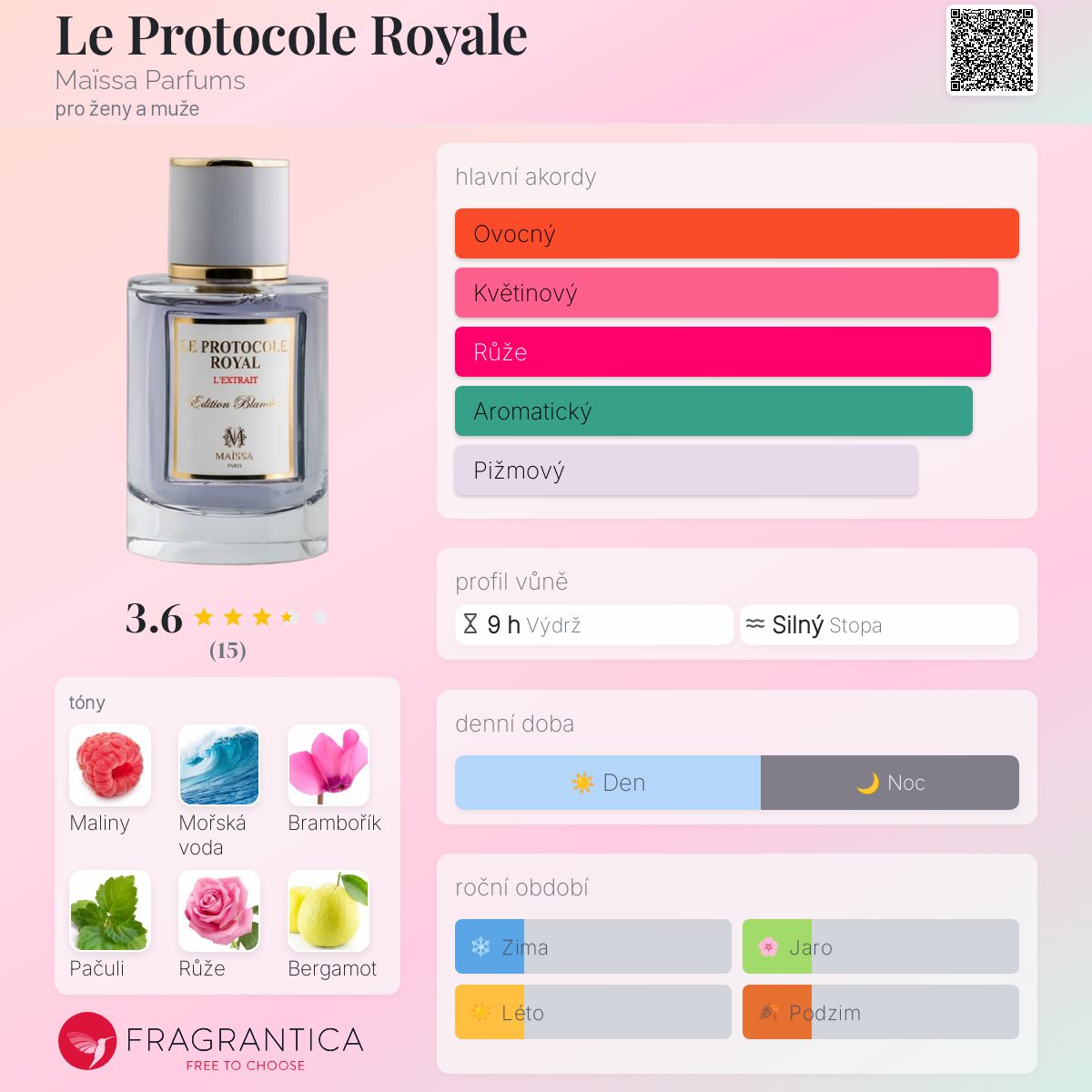 Le Protocole Royale podle Maïssa Parfums je Floral Aquatic vůně pro ženy a muže. Le Protocole Royale byl/a uveden/a v roce 2020. Vrchní tóny jsou Maliny, Mořské tóny a Bergamot; střední tóny jsouBrambořík, Pačuli, Bulharská růže, Pelargónie, Zelené tóny a Magnólie ; základní tóny jsou Ambroxan, Pižmo, Jantar (ambra) a Vanilka.