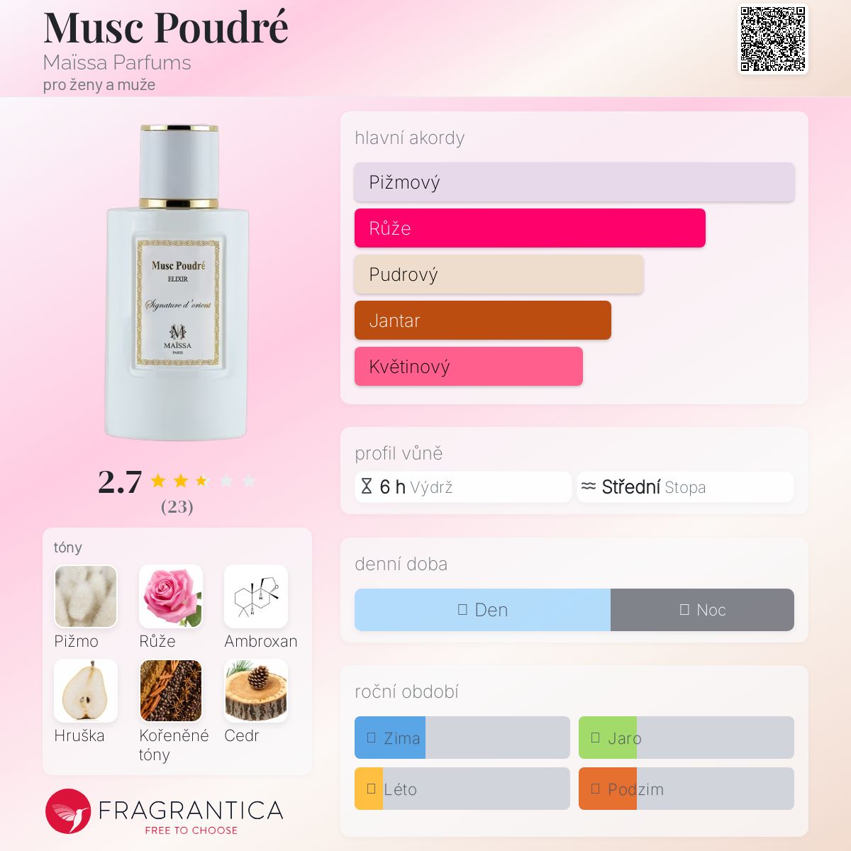 Musc Poudré podle Maïssa Parfums je Floral Woody Musk vůně pro ženy a muže. Musc Poudré byl/a uveden/a v roce 2023. Vrchní tóny jsou Hruška a Lískový oříšek; střední tóny jsouRůže, Koření a Cedr ; základní tóny jsou Bílé pižmo a Ambroxan.