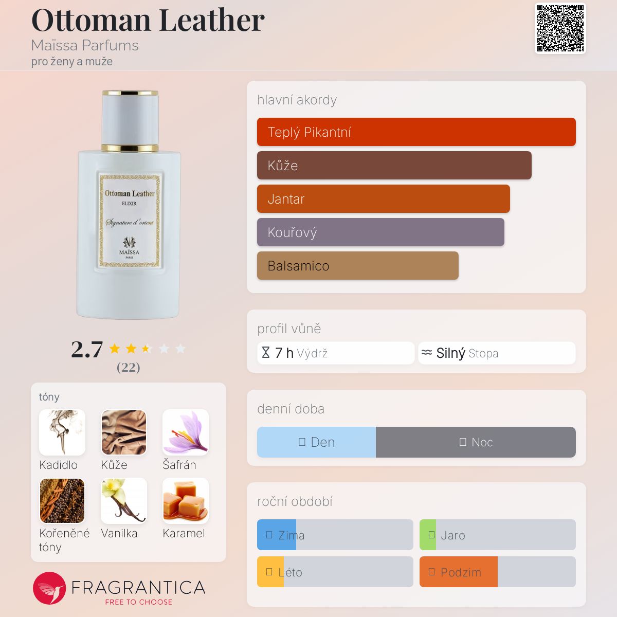Ottoman Leather podle Maïssa Parfums je Leather vůně pro ženy a muže. Ottoman Leather byl/a uveden/a v roce 2023. Vrchní tóny jsou Kadidlo a Karamel; střední tóny jsouŠafrán, Koření, Labdanum a Bílé dřevo ; základní tóny jsou Kůže, Vanilka a Kosatec.