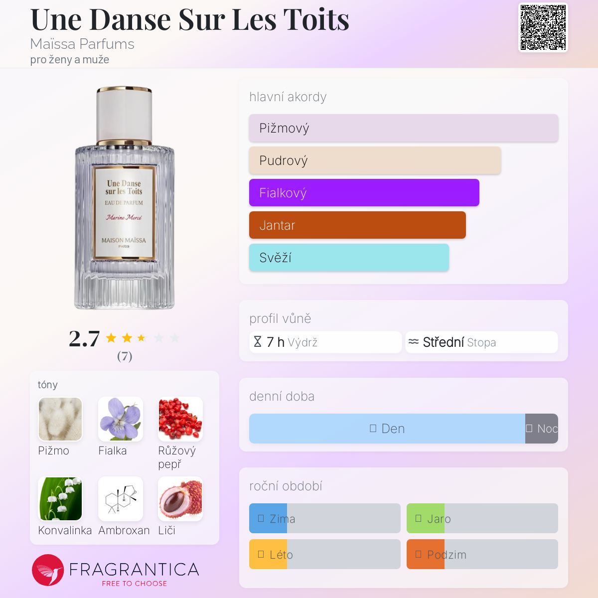 Une Danse Sur Les Toits podle Maïssa Parfums je Floral vůně pro ženy a muže. Toto je nová vůně. Une Danse Sur Les Toits byl/a uveden/a v roce 2025. "Nosem" za touto vůní je Marine Mercé. Vrchní tóny jsou Růžový pepř, Liči, Elimi a Zázvor; střední tóny jsouPižmo, Fialka, Konvalinka a Růže ; základní tóny jsou Pižmo, Ambroxan, Kadidlo, Laktóny a Santalové dřevo.