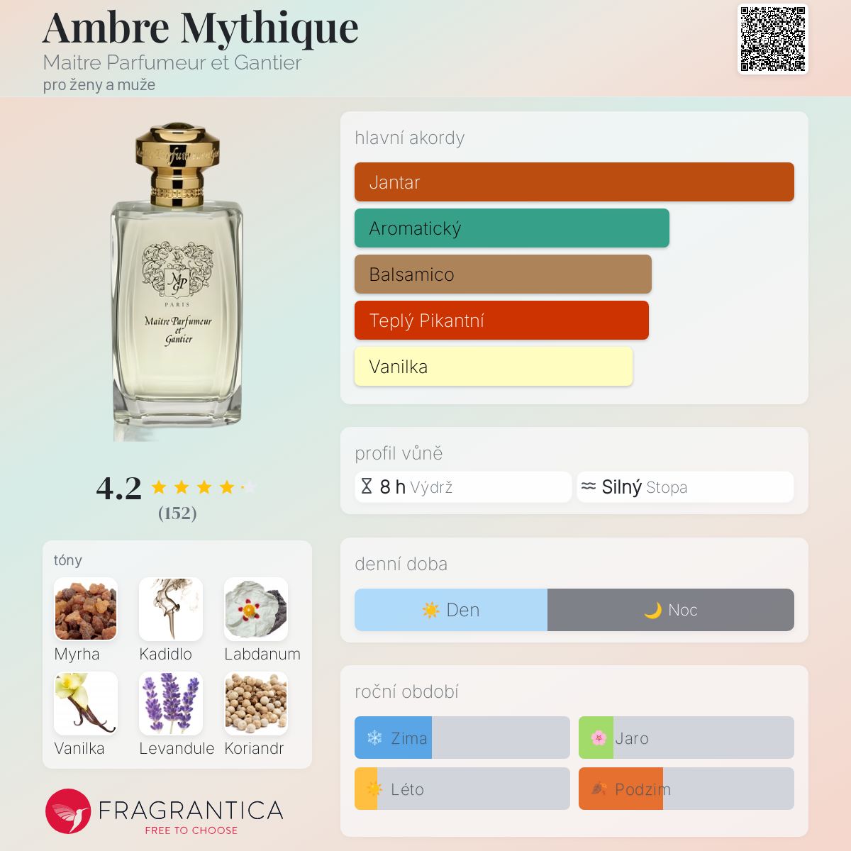 Ambre Mythique podle Maitre Parfumeur et Gantier je Aromatic vůně pro ženy a muže. Ambre Mythique byl/a uveden/a v roce 2016. Vrchní tóny jsou Kadidlo, Koriandr, Pelargónie a Bergamot; střední tóny jsouMyrha, Labdanum a Levandule ; základní tóny jsou Vanilka, Fazole tonka, Santalové dřevo a Pačuli.