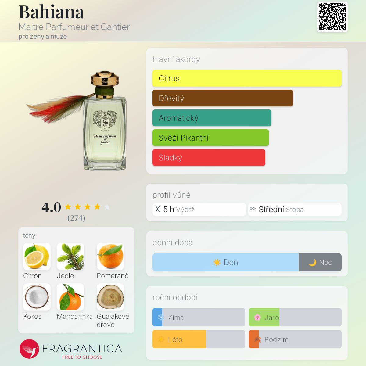 Bahiana podle Maitre Parfumeur et Gantier je Floral vůně pro ženy a muže. Bahiana byl/a uveden/a v roce 2005. "Nosem" za touto vůní je Jeanne-Marie Faugier. Vrchní tóny jsou Citrón, Pomeranč a Mandarinka; střední tóny jsouJedlová pryskyřice, Guajakové dřevo a Růže ; základní tóny jsou Kokos, Pižmo a Jantar (ambra).