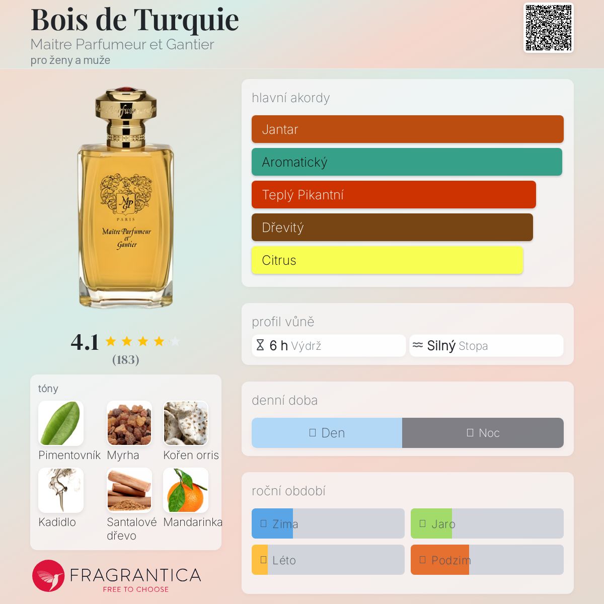 Bois de Turquie podle Maitre Parfumeur et Gantier je Woody Aromatic vůně pro ženy a muže. Bois de Turquie byl/a uveden/a v roce 2008. "Nosem" za touto vůní je Jean-Paul Millet Lage. Vrchní tóny jsou Mandarinka, Pomerančový květ a Bergamot; střední tóny jsouPimentovník, Kořen orris, Jasmín a Pelargónie ; základní tóny jsou Myrha, Kadidlo, Santalové dřevo a Pačuli.