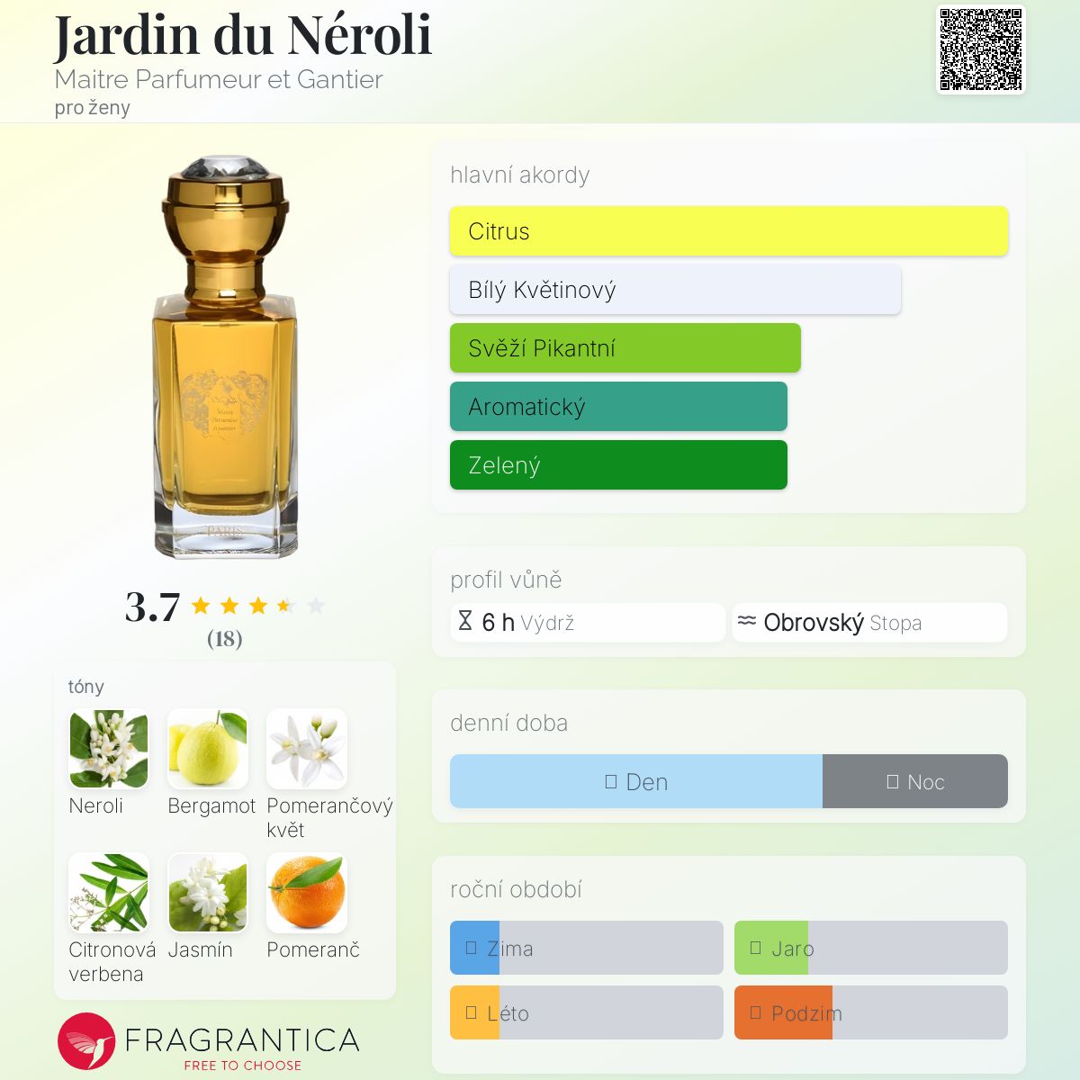 Jardin du Néroli podle Maitre Parfumeur et Gantier je Floral vůně pro ženy. Jardin du Néroli byl/a uveden/a v roce 2003. "Nosem" za touto vůní je Jean-Paul Millet Lage. Vrchní tóny jsou Neroli, Bergamot a Pomeranč; střední tóny jsouKvět afrického pomeranče, Jasmín a Máta ; základní tóny jsou Citronová verbena a Santalové dřevo.