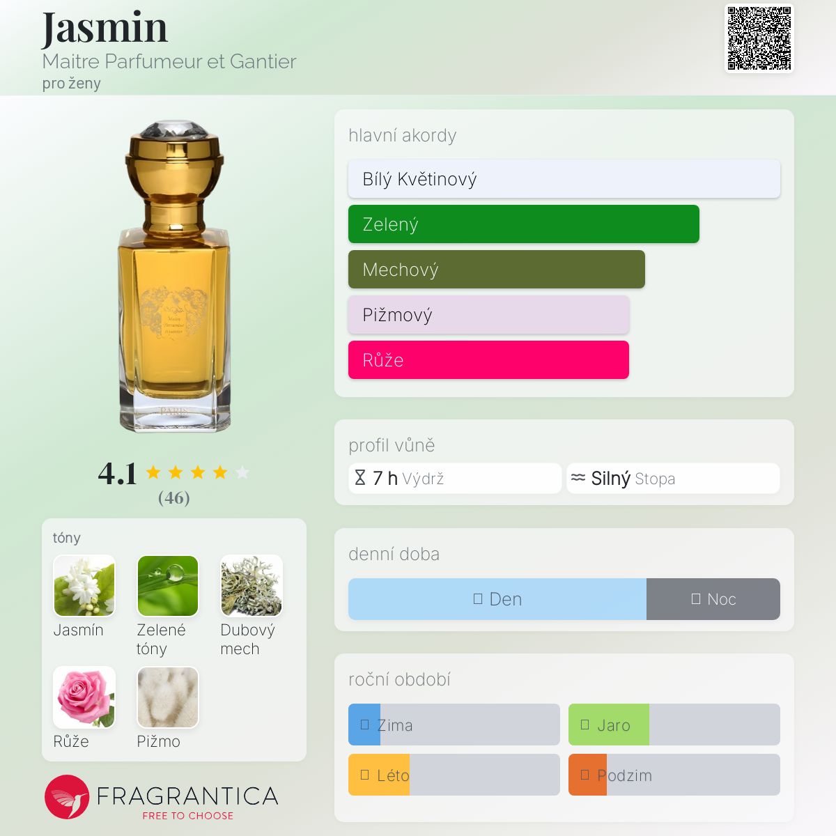 Jasmin podle Maitre Parfumeur et Gantier je Floral vůně pro ženy. Jasmin byl/a uveden/a v roce 1988. Vrchní tóny jsou Zelené tóny a Růže; střední tón jeJasmín ; základní tóny jsou Dubový mech a Pižmo.