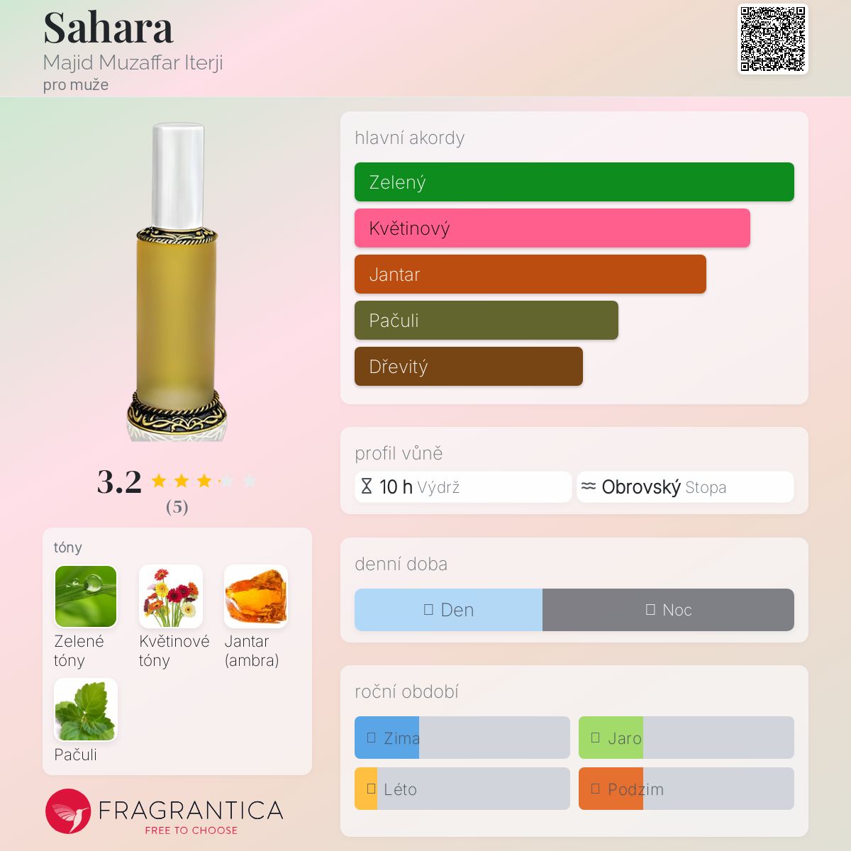 Sahara podle Majid Muzaffar Iterji je Woody Aromatic vůně pro muže. Vrchní tón je Bylinné tóny ; střední tóny jsouKvětinové tóny a Pačuli ; základní tón je Jantar (ambra).