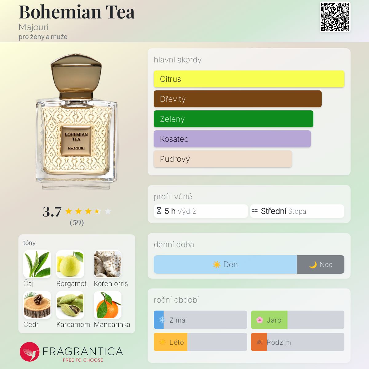Bohemian Tea podle Majouri je Citrus Aromatic vůně pro ženy a muže. Bohemian Tea byl/a uveden/a v roce 2023. Vrchní tóny jsou Bergamot, Kardamom a Mandarinka; střední tóny jsouZelený čaj, Orris a Pomerančový květ ; základní tóny jsou Cedr, Guajakové dřevo a Pižmo.