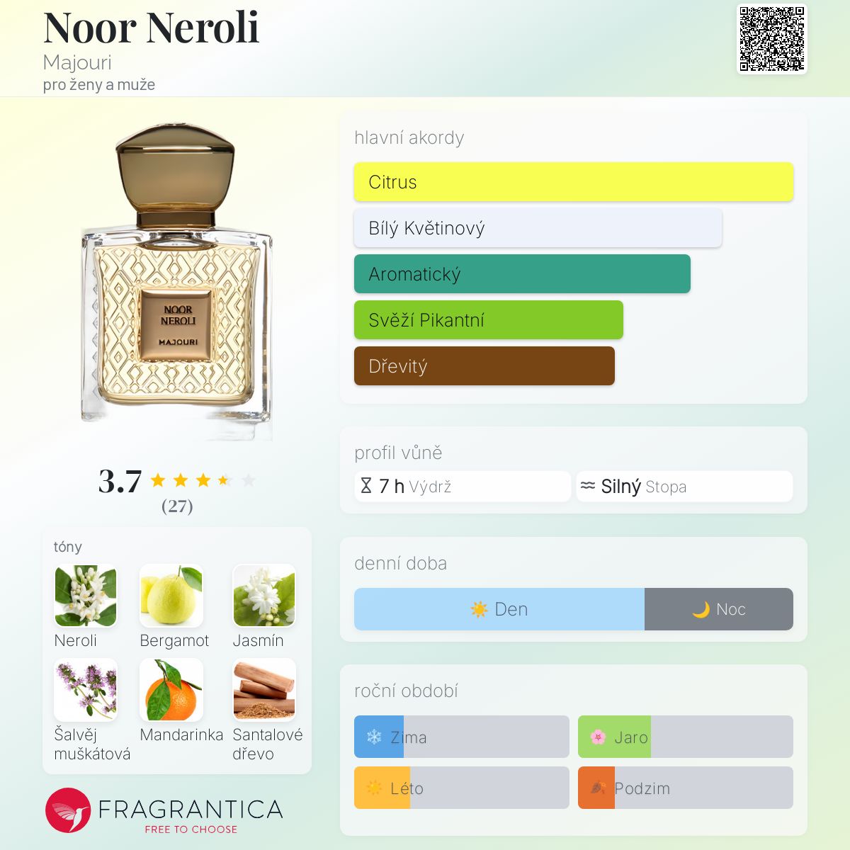 Noor Neroli podle Majouri je Floral vůně pro ženy a muže. Noor Neroli byl/a uveden/a v roce 2023. Vrchní tóny jsou Bergamot a Mandarinka; střední tóny jsouNeroli, Jasmín, Šalvěj muškátová a Levandule ; základní tóny jsou Santalové dřevo, Ambra a Pižmo.