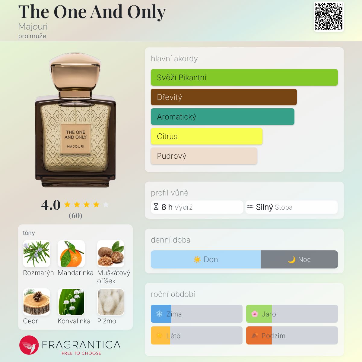 The One And Only podle Majouri je Woody vůně pro muže. The One And Only byl/a uveden/a v roce 2019. "Nosem" za touto vůní je Christian Vermorel. Vrchní tóny jsou Mandarinka, Citrón a Bergamot; střední tóny jsouRozmarýn, Muškátový oříšek a Konvalinka ; základní tóny jsou Cedr, Pižmo a Vanilka.