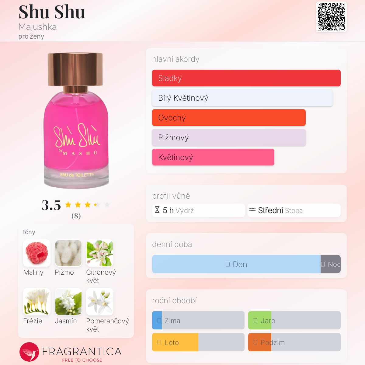 Shu Shu podle Majushka je Floral Fruity Gourmand vůně pro ženy. Shu Shu byl/a uveden/a v roce 2020. "Nosem" za touto vůní je Bertrand Duchaufour. Vrchní tóny jsou Citronový květ a Frézie; střední tóny jsouMaliny, Jasmín, Pomerančový květ a Makronky ; základní tóny jsou Pižmo a Dřevité tóny.