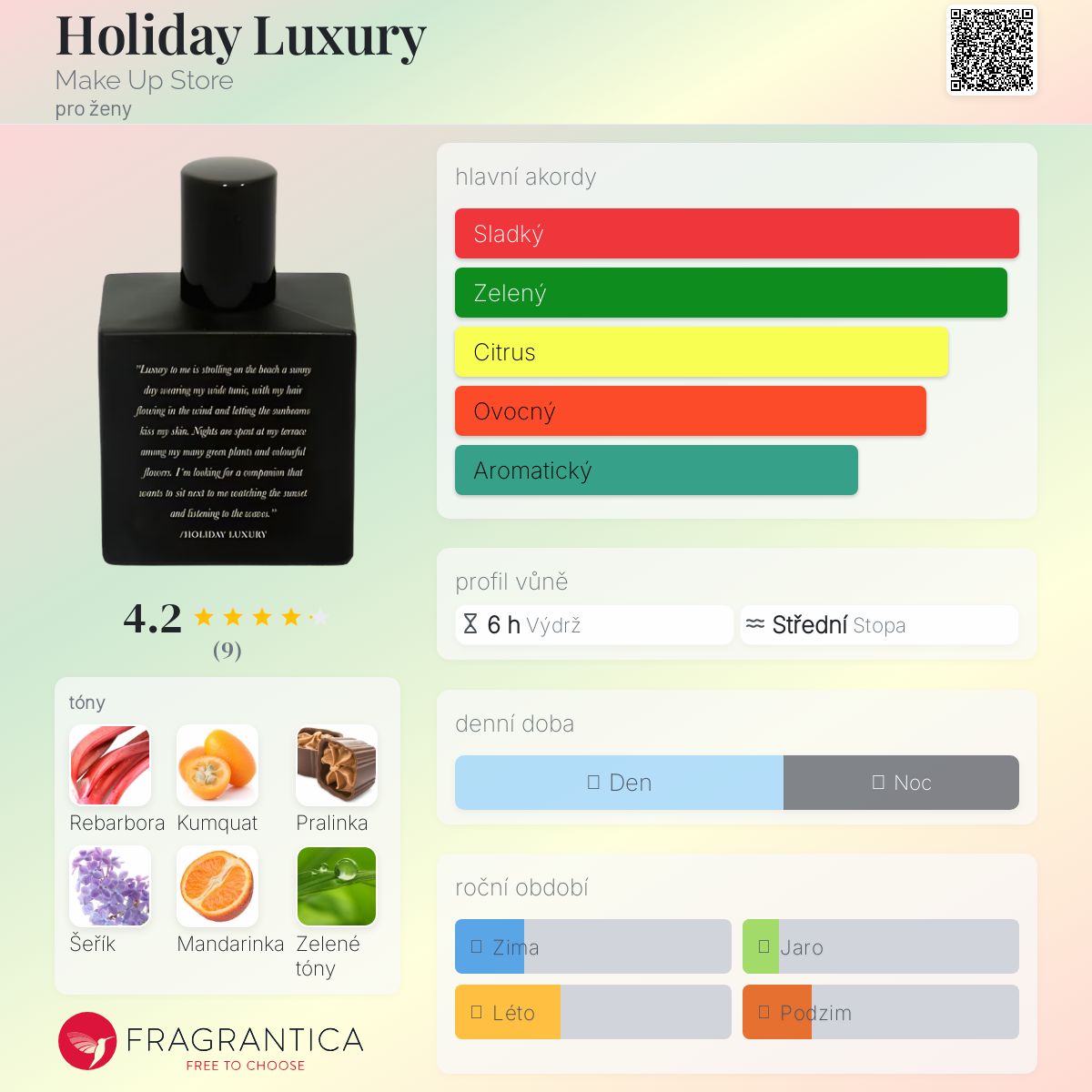 Holiday Luxury podle Make Up Store je Floral Fruity Gourmand vůně pro ženy. Vrchní tóny jsou Rebarbora, Kumquat a Mandarinka; střední tóny jsouŠeřík, Zelené tóny a Jasmín ; základní tóny jsou Pralinka a Broskev.
