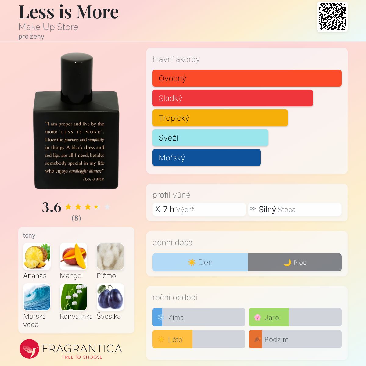 Less is More podle Make Up Store je Floral Fruity vůně pro ženy. Vrchní tóny jsou Ananas, Mandarinka a Červený rybíz; střední tóny jsouMango, Konvalinka a Brambořík ; základní tóny jsou Pižmo, Mořské tóny a Švestka.