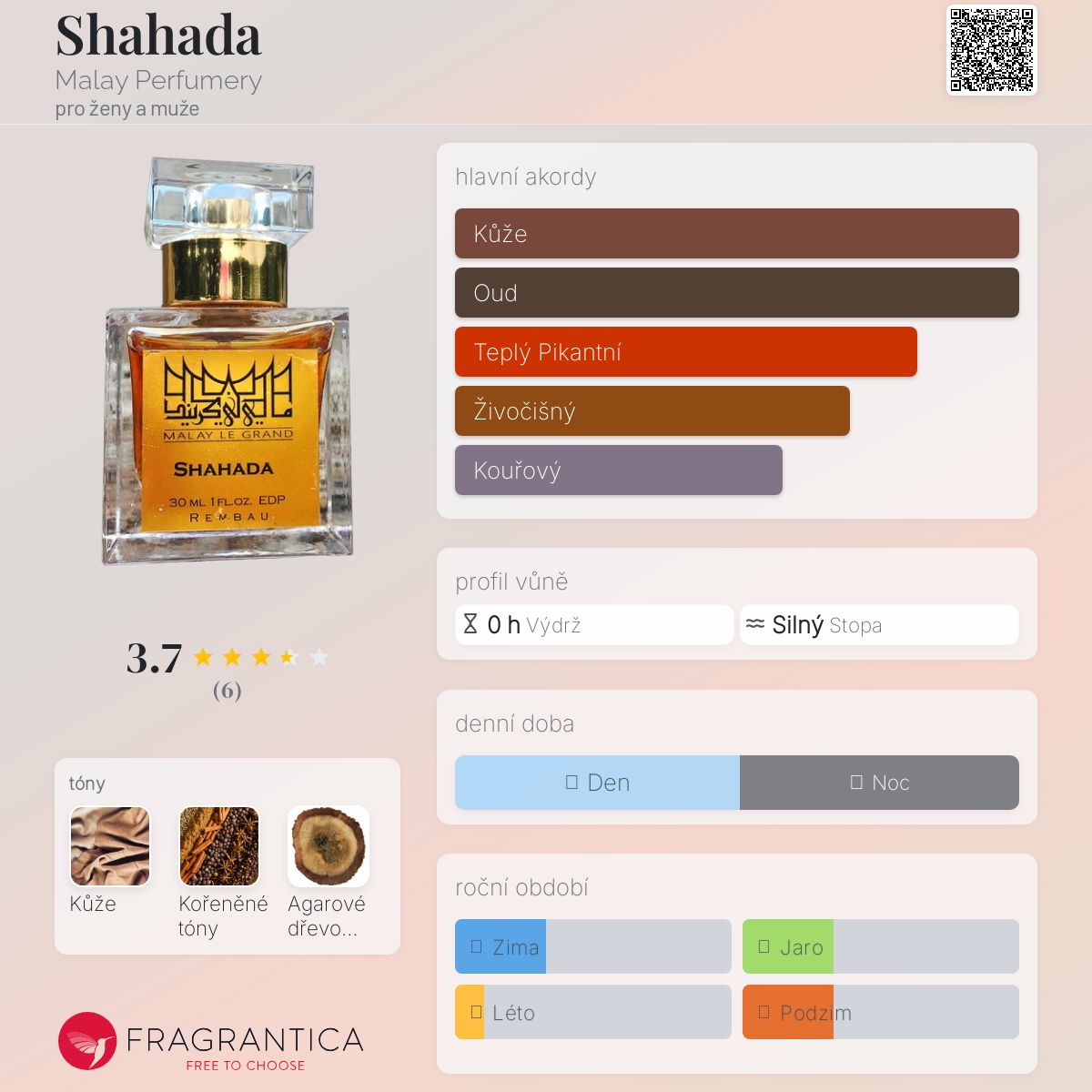Shahada podle Malay Perfumery je Leather vůně pro ženy a muže. Shahada byl/a uveden/a v roce 2019. "Nosem" za touto vůní je Fazzillah Noordin.