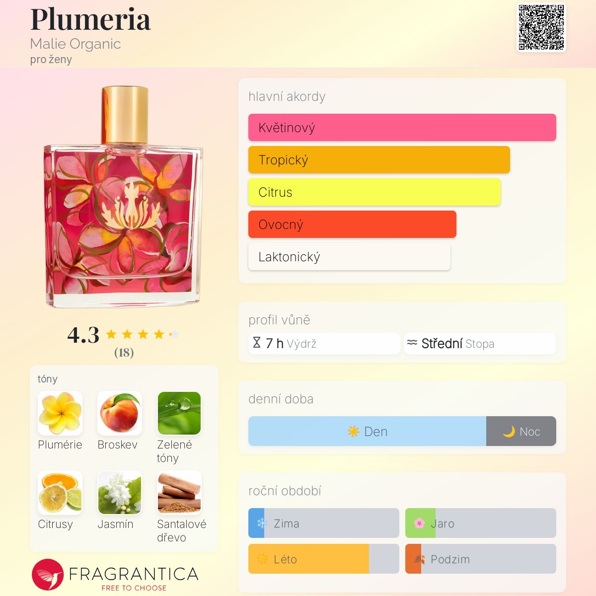 Plumeria podle Malie Organic je Floral vůně pro ženy. Plumeria byl/a uveden/a v roce 2015. Vrchní tóny jsou Zelené tóny a Citrusy; střední tóny jsouPlumérie a Broskev ; základní tóny jsou Jasmín a Santalové dřevo.