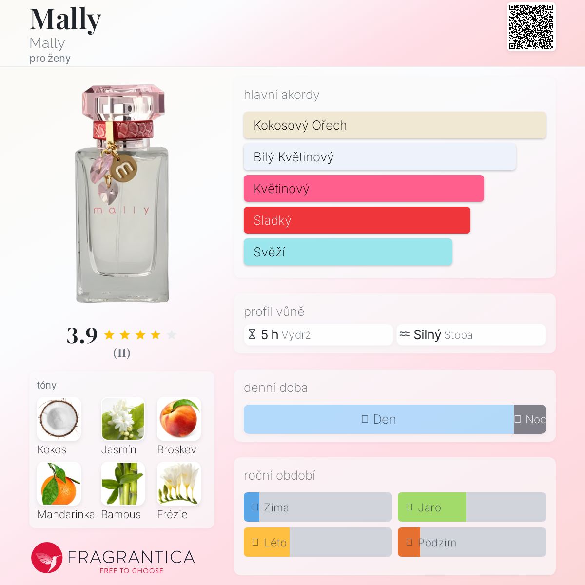 Mally podle Mally je Floral Fruity vůně pro ženy. Mally byl/a uveden/a v roce 2009. "Nosem" za touto vůní je Nicole Mancini. Vrchní tóny jsou Jasmín, Mandarinka, Bambus, Palmový list a Červené bobule; střední tóny jsouFrézie, Pivoňka a Konvalinka ; základní tóny jsou Kokos, Broskev, Pižmo a Santalové dřevo.