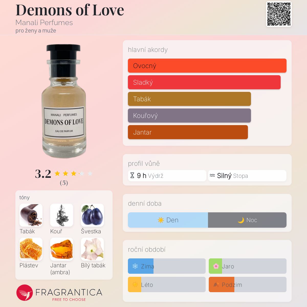 Demons of Love podle Manali Perfumes je Orientální Spicy vůně pro ženy a muže. Demons of Love byl/a uveden/a v roce 2023. Vrchní tóny jsou Tabákový list a Plástev; střední tóny jsouKouř, Švestka, Jantar (ambra) a Bílý tabák ; základní tóny jsou Orientální tóny, Ovocné tóny a Citrusy.
