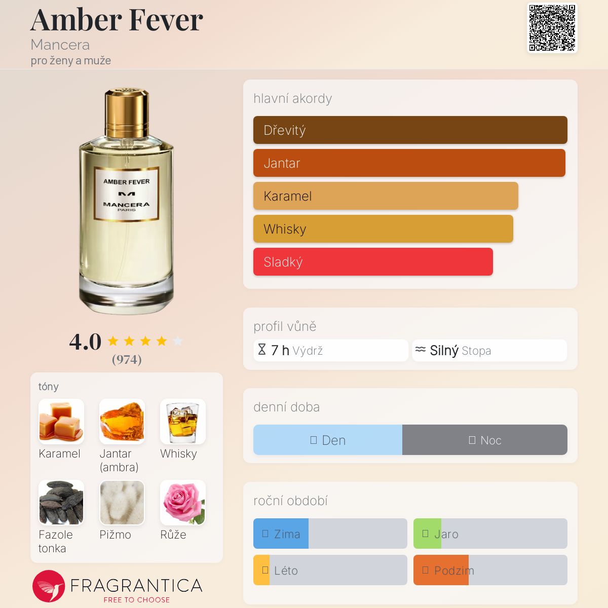 Amber Fever podle Mancera je Orientální Vanilla vůně pro ženy a muže. Amber Fever byl/a uveden/a v roce 2019. Vrchní tóny jsou Karamel, Whisky, Fazole tonka a Lískový oříšek; střední tóny jsouOkvětní lístky růží, Fialka a Indický jasmín ; základní tóny jsou Jantar (ambra), Bílé pižmo, Týkové dřevo a Dubový mech.