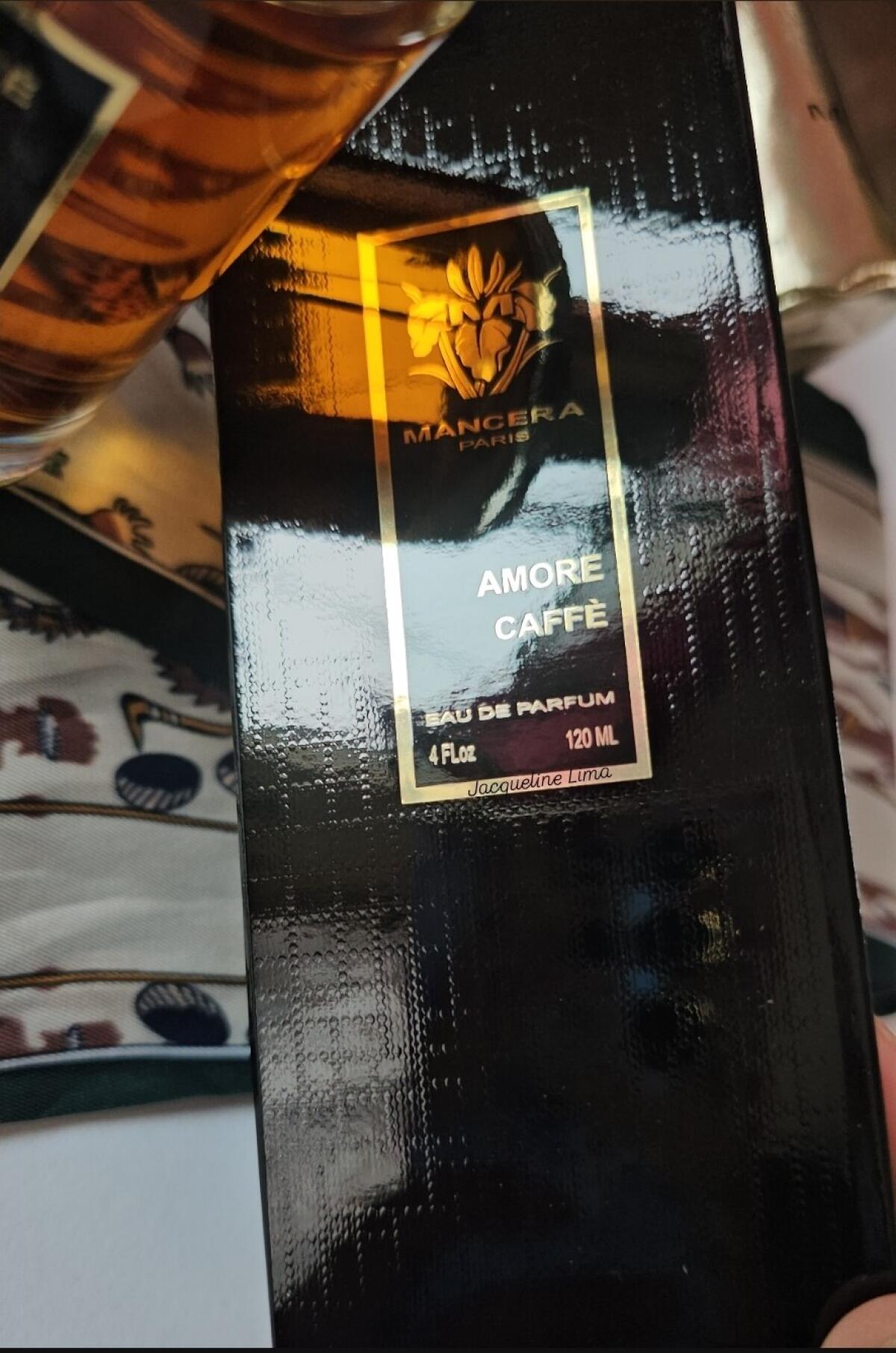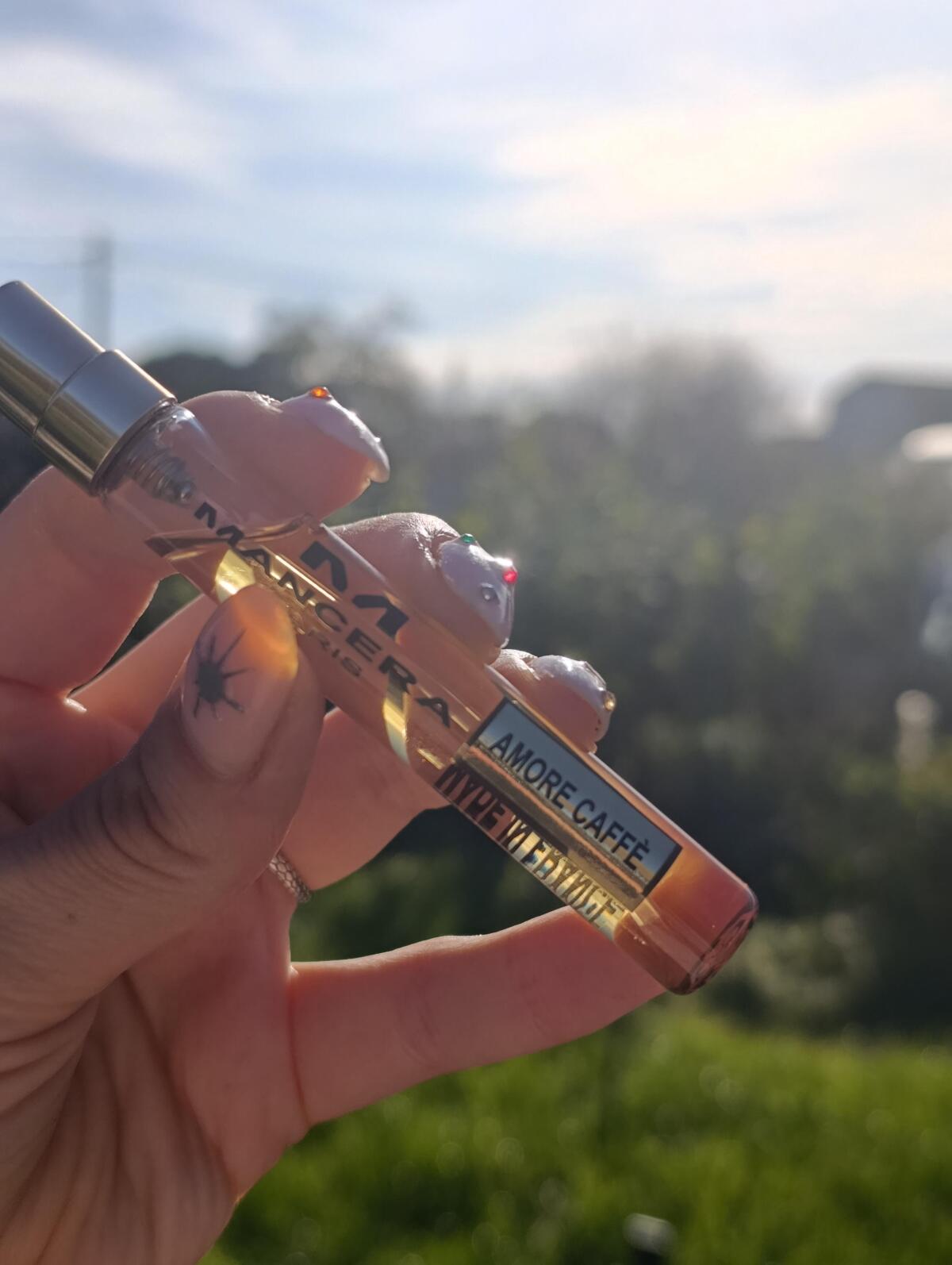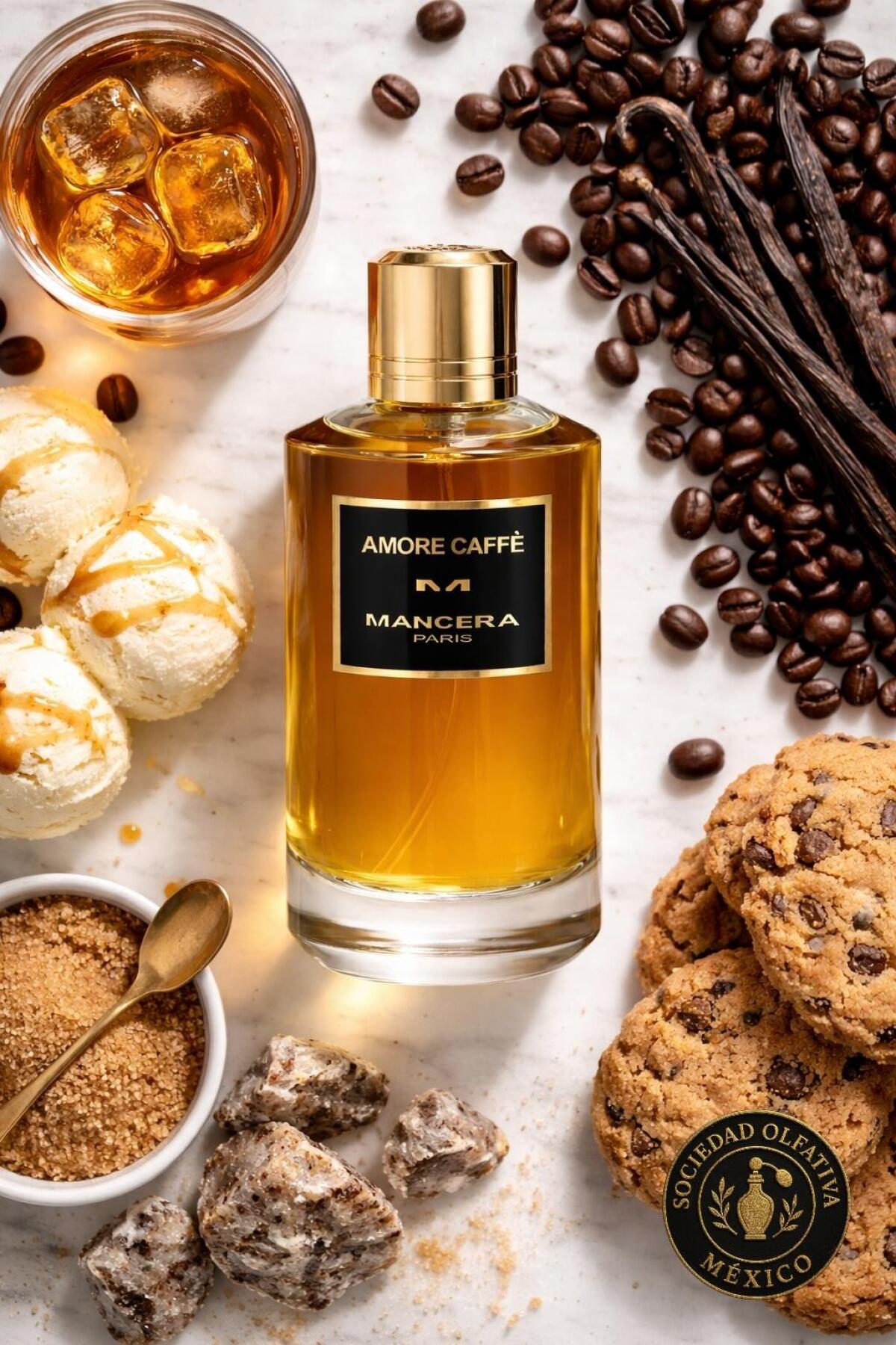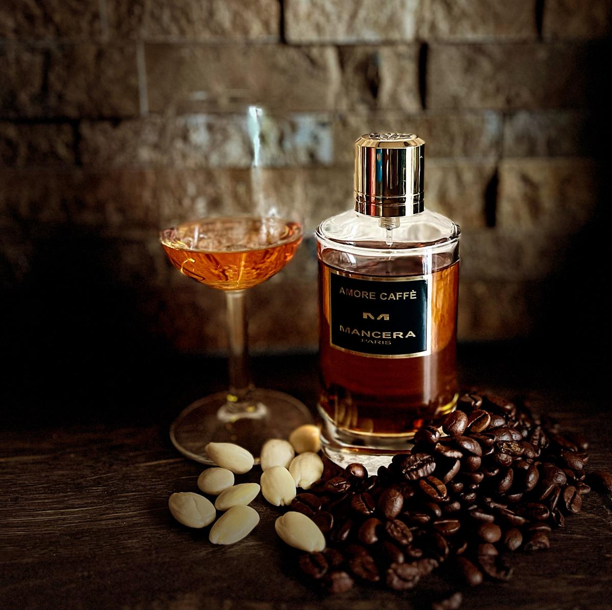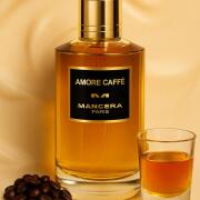 Amore Caffè začíná nádechem sladkých kávových zrn, jaká se dávají jako ozdoba na kávovou zmrzlinu, úvod připomíná TK's Coffee addict, ale pak se změní. Na mé kůži působí jako vanilková zmrzlina utopená v kávě, sladká, karamelizovaná, s pralinkami a s rozdrobeným amarettem navrchu. Může také připomínat čokoládu s kávovými zrny uvnitř, kterou dávají k espressu v kavárně, nebo ledový kávový krém. Můžete také cítit vůni karamelizovaného, spáleného cukru z creme brulèe. Stejný nádech sladké kávy jako v kavárně Montale Ristretto Intense, ale samozřejmě bez růže.