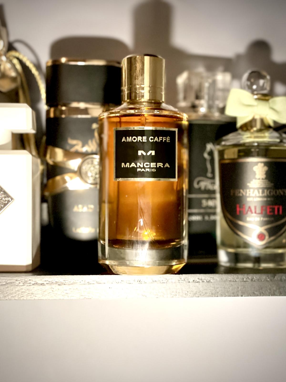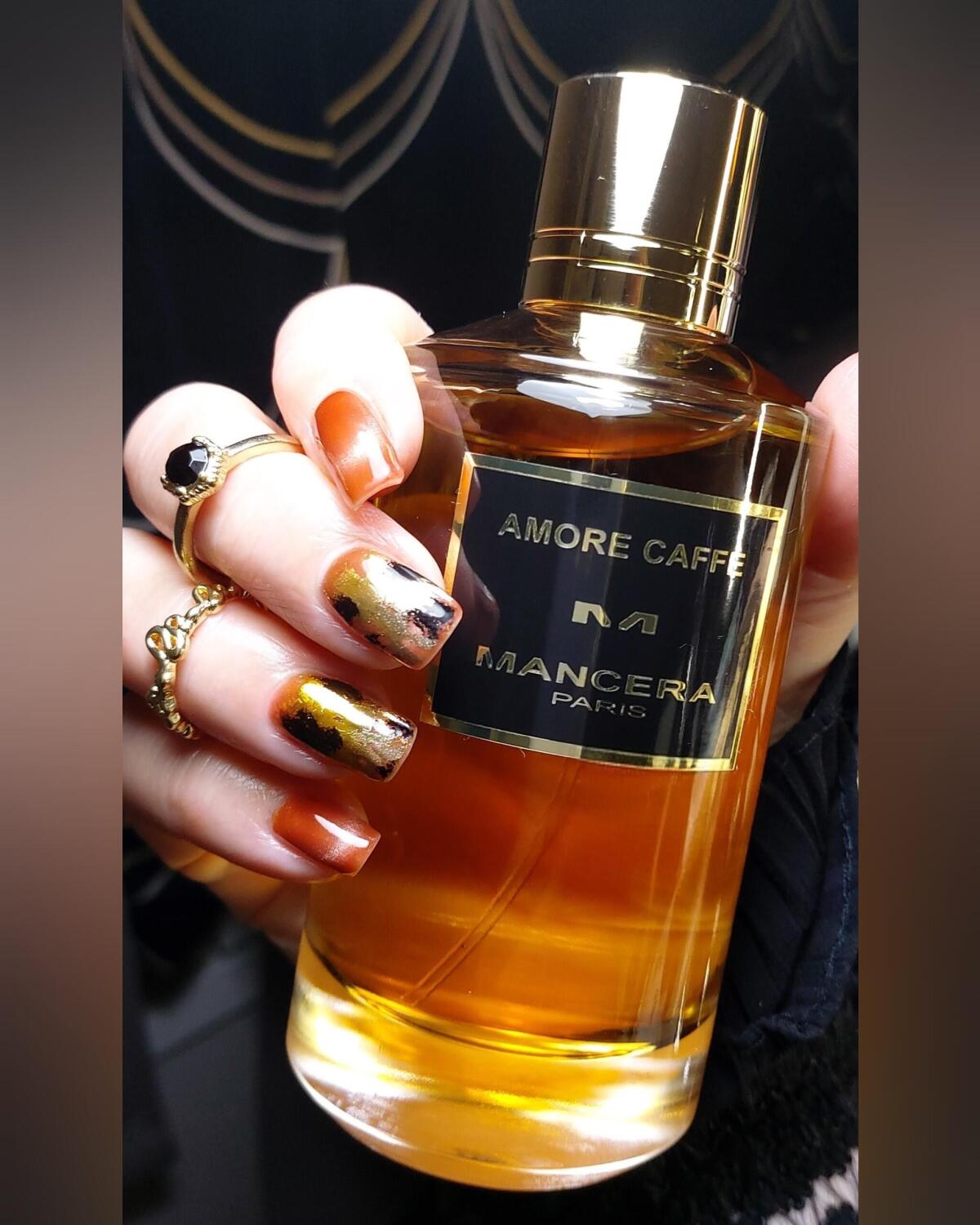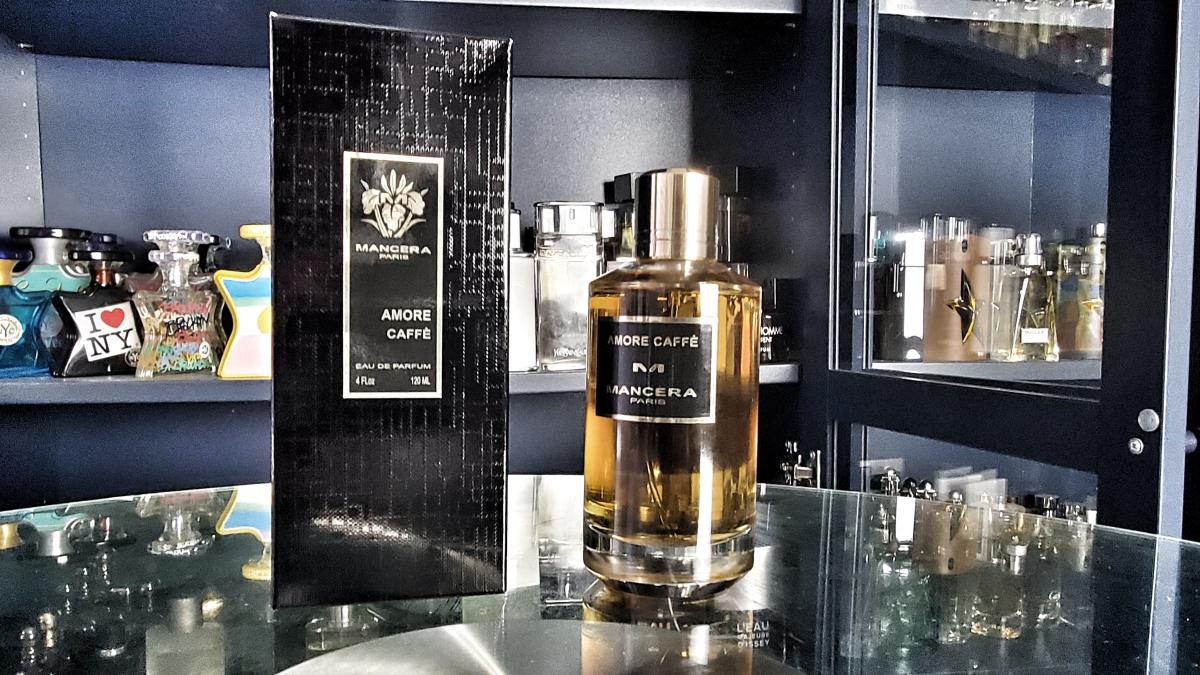 Amore Caffè začíná nádechem sladkých kávových zrn, jaká se dávají jako ozdoba na kávovou zmrzlinu, úvod připomíná TK's Coffee addict, ale pak se změní. Na mé kůži působí jako vanilková zmrzlina utopená v kávě, sladká, karamelizovaná, s pralinkami a s rozdrobeným amarettem navrchu. Může také připomínat čokoládu s kávovými zrny uvnitř, kterou dávají k espressu v kavárně, nebo ledový kávový krém. Můžete také cítit vůni karamelizovaného, spáleného cukru z creme brulèe. Stejný nádech sladké kávy jako v kavárně Montale Ristretto Intense, ale samozřejmě bez růže.