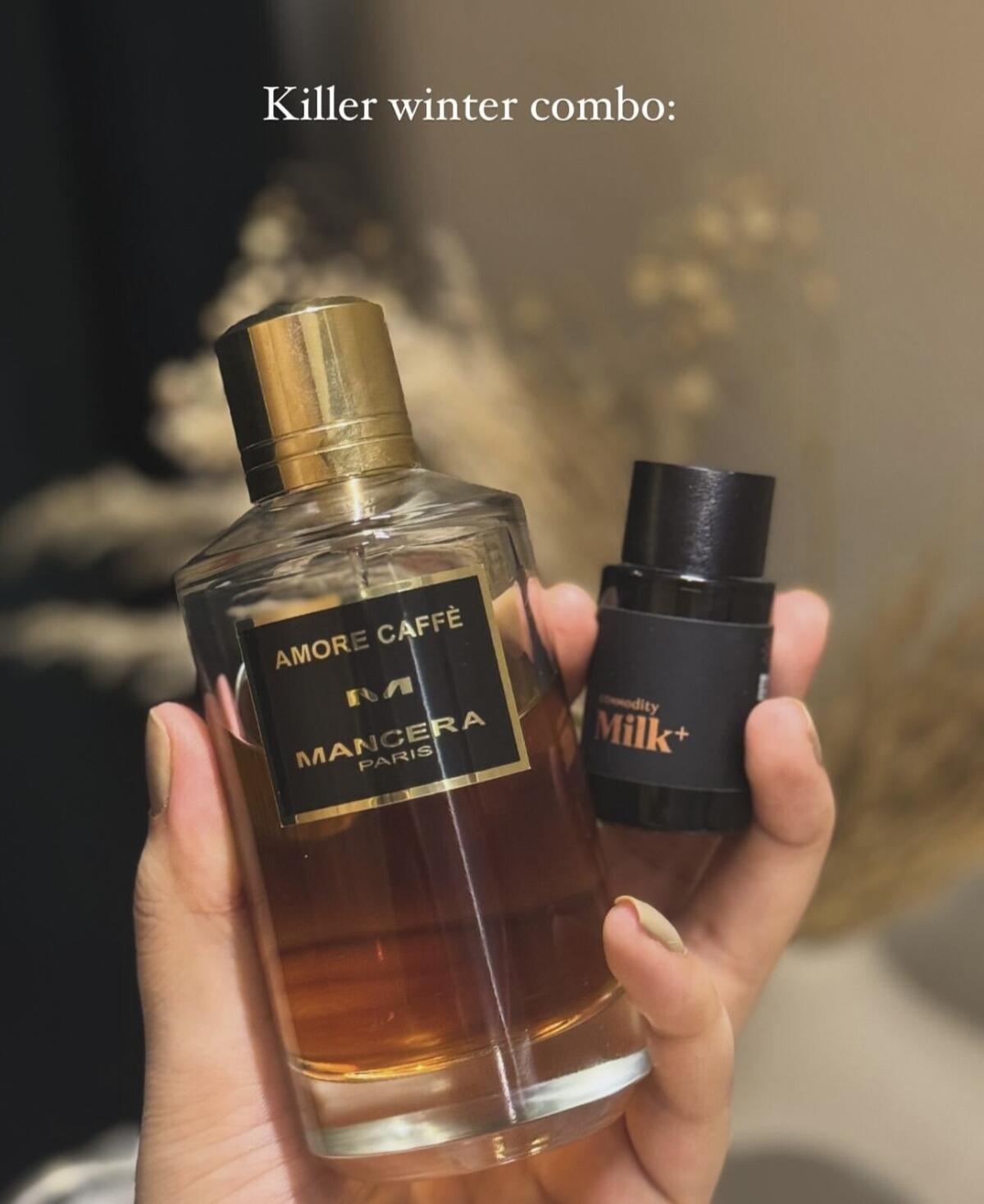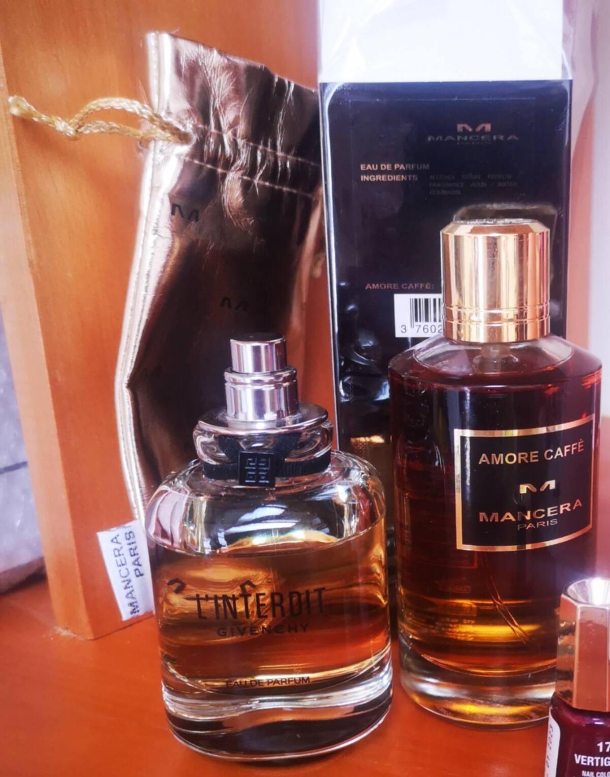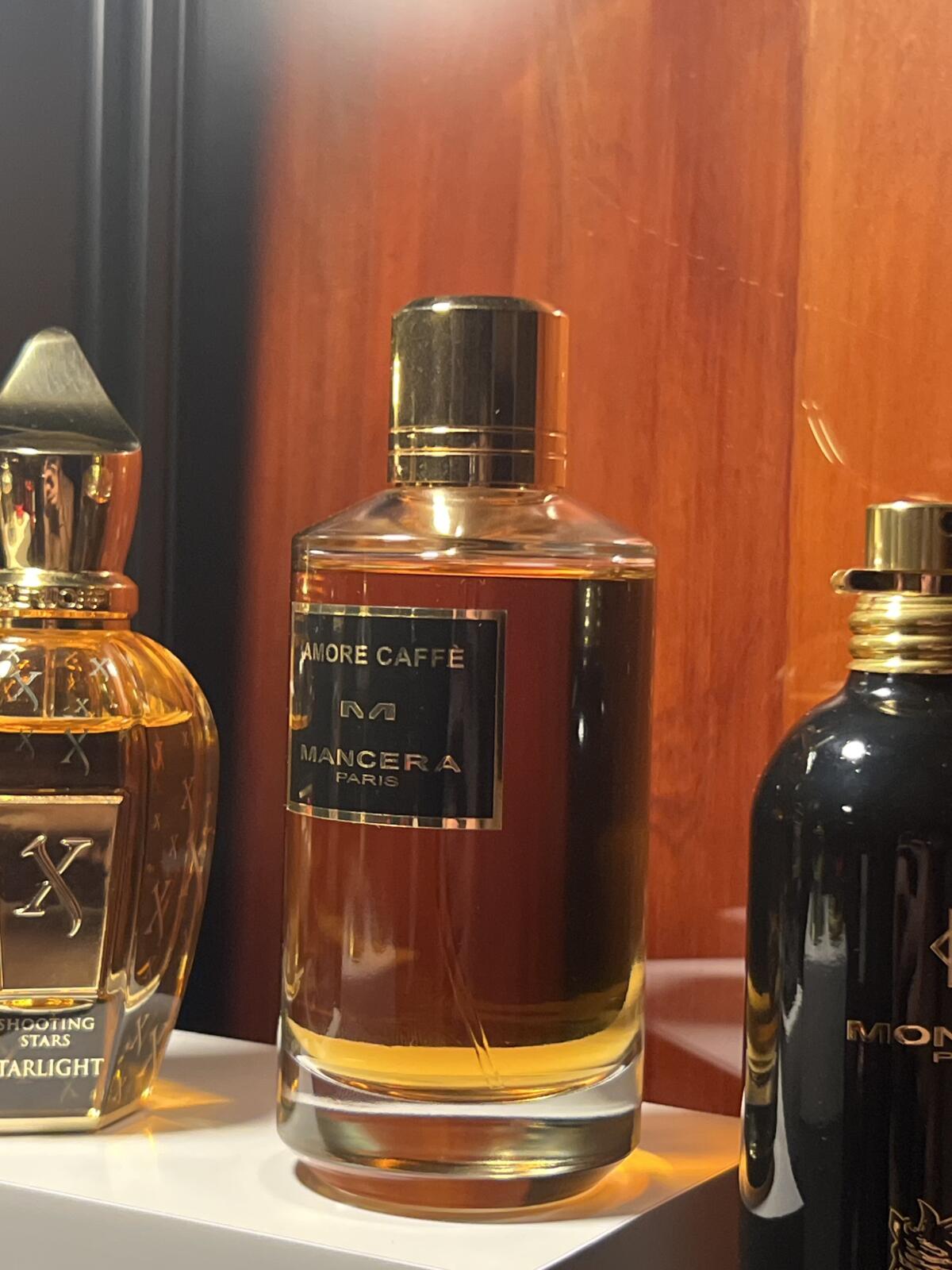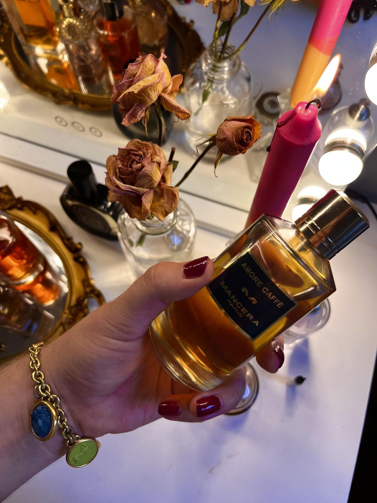 Amore Caffè začíná nádechem sladkých kávových zrn, jaká se dávají jako ozdoba na kávovou zmrzlinu, úvod připomíná TK's Coffee addict, ale pak se změní. Na mé kůži působí jako vanilková zmrzlina utopená v kávě, sladká, karamelizovaná, s pralinkami a s rozdrobeným amarettem navrchu. Může také připomínat čokoládu s kávovými zrny uvnitř, kterou dávají k espressu v kavárně, nebo ledový kávový krém. Můžete také cítit vůni karamelizovaného, spáleného cukru z creme brulèe. Stejný nádech sladké kávy jako v kavárně Montale Ristretto Intense, ale samozřejmě bez růže.