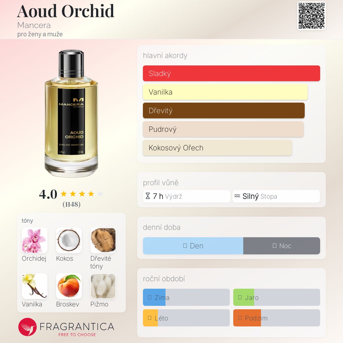 Aoud Orchid podle Mancera je Orientální Floral vůně pro ženy a muže. Aoud Orchid byl/a uveden/a v roce 2016. "Nosem" za touto vůní je Pierre Montale. Vrchní tóny jsou Kokos, Broskev a Mandarinka; střední tóny jsouOrchidej a Pačuli ; základní tóny jsou Dřevité tóny, Vanilka, Bílé pižmo a Jantar (ambra).