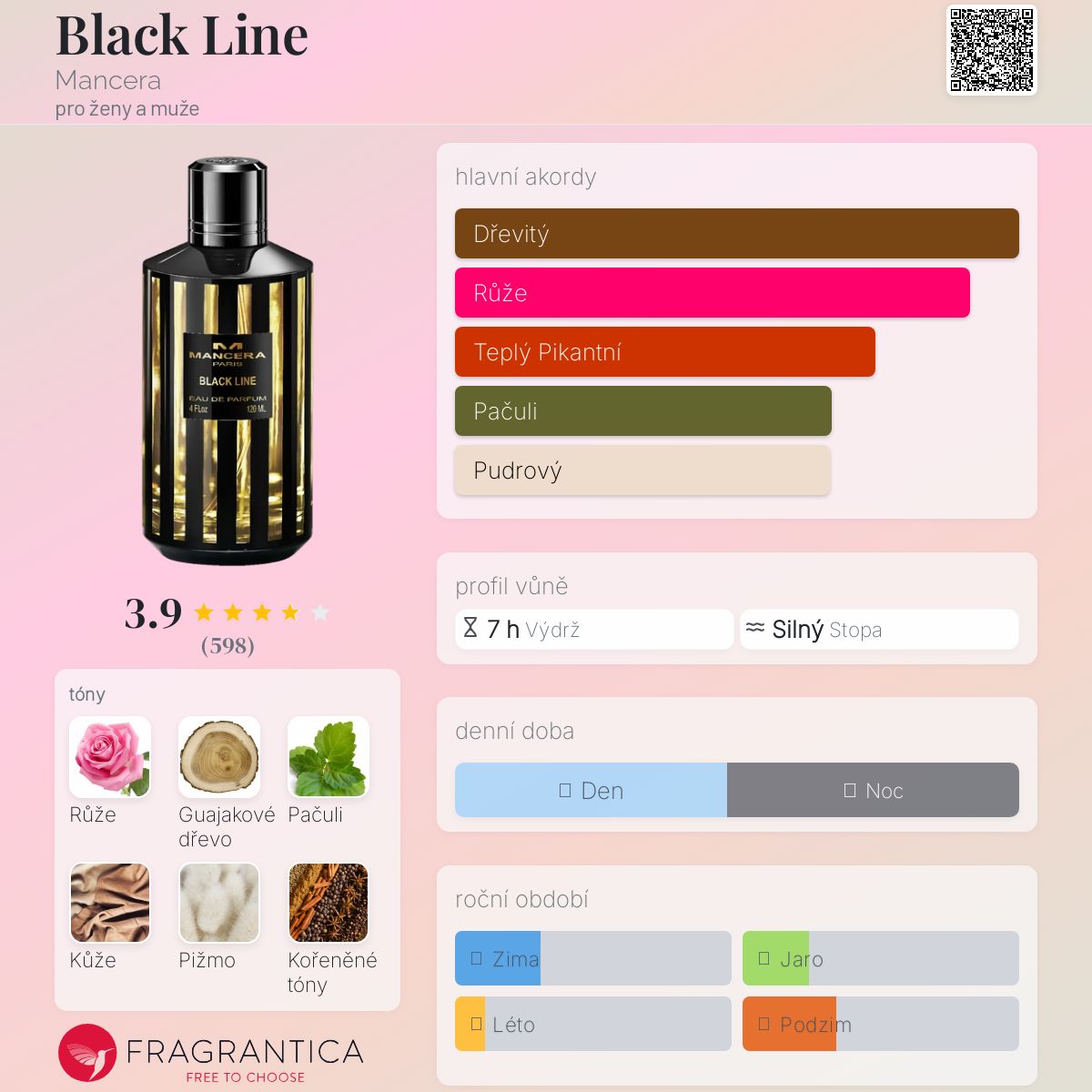 Black Line podle Mancera je Orientální Woody vůně pro ženy a muže. Black Line byl/a uveden/a v roce 2013. "Nosem" za touto vůní je Pierre Montale. Vrchní tón je Kořeněné tóny ; střední tóny jsouRůže, Pačuli, Kůže a Jantar (ambra) ; základní tóny jsou Guajakové dřevo, Bílé pižmo a Santalové dřevo.