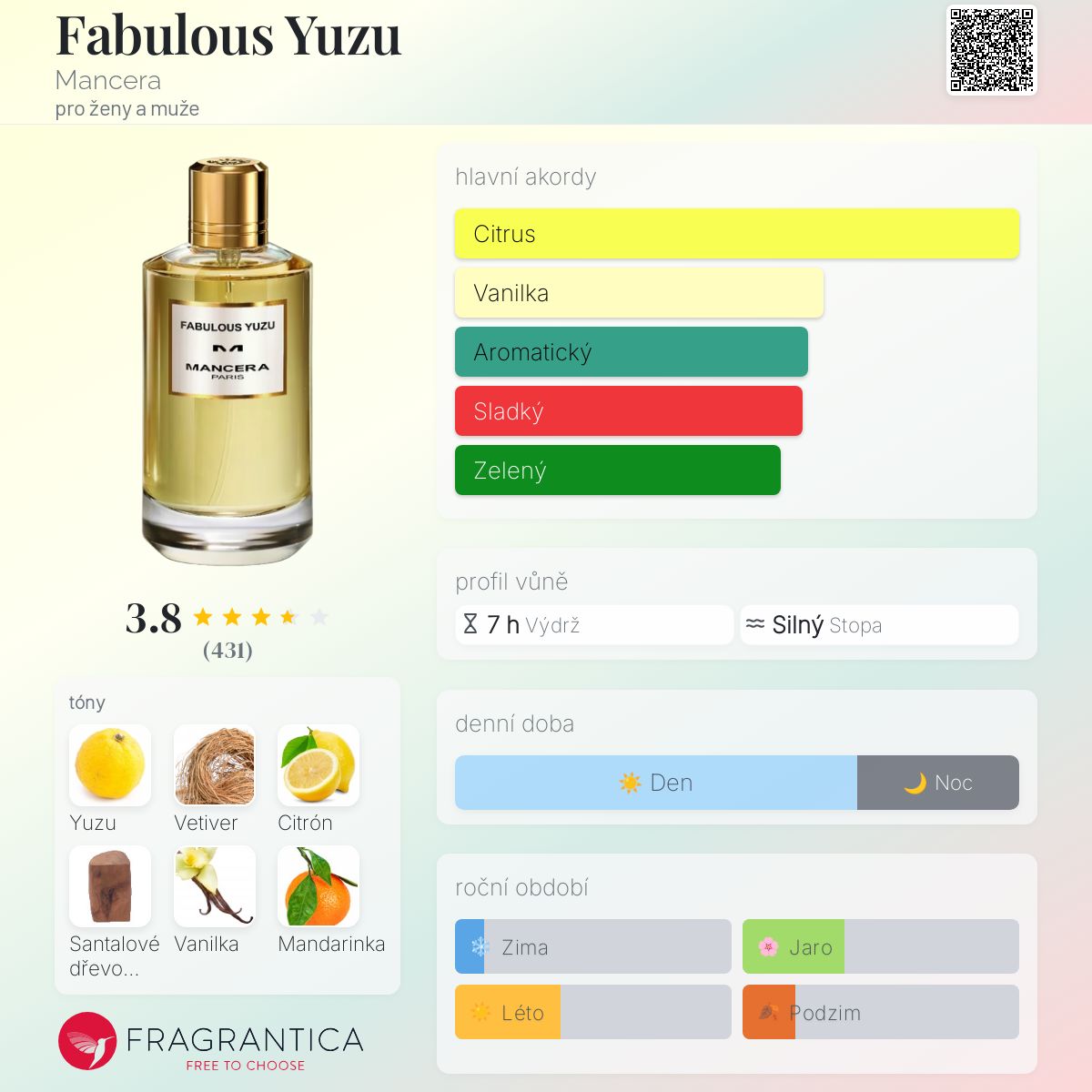Fabulous Yuzu podle Mancera je Orientální Floral vůně pro ženy a muže. Toto je nová vůně. Fabulous Yuzu byl/a uveden/a v roce 2022. "Nosem" za touto vůní je Pierre Montale. Vrchní tóny jsou Yuzu, Citrón, Mandarinka a Skořice; střední tóny jsouKořen vetiveru, Mimóza a Jasmín ; základní tóny jsou Santalové dřevo Mysore, Vanilka a Fazole tonka.