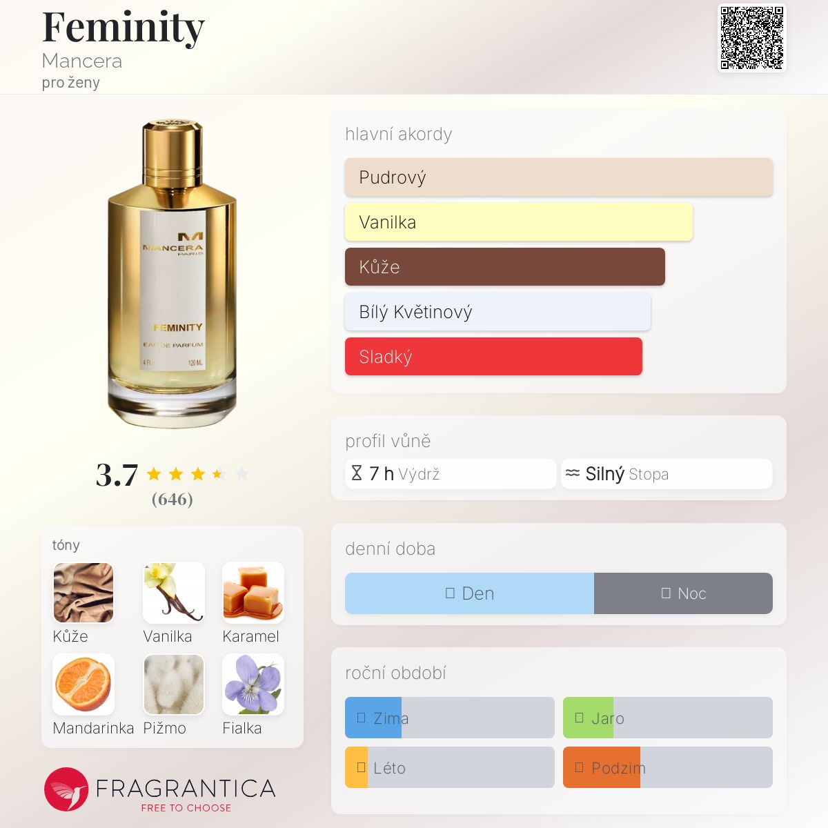 Feminity podle Mancera je Orientální Floral vůně pro ženy. Feminity byl/a uveden/a v roce 2020. "Nosem" za touto vůní je Pierre Montale. Vrchní tóny jsou Kůže, Mandarinka, Růžový pepř a Káva; střední tóny jsouFialka, Otočník, Jasmín a Konvalinka ; základní tóny jsou Vanilkový lusk, Karamel, Bílé pižmo, Santalové dřevo, Jantar (ambra) a Dubový mech.