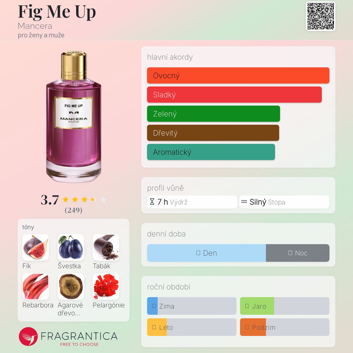 Fig Me Up podle Mancera je Aromatic Green vůně pro ženy a muže. Toto je nová vůně. Fig Me Up byl/a uveden/a v roce 2024. "Nosem" za touto vůní je Pierre Montale. Vrchní tóny jsou Rebarbora, Fíkový list a Francouzská fialka; střední tóny jsouFíkový nektar, Švestka, Agarové dřevo (oud), Bourbonské geránium a Australské santalové dřevo ; základní tóny jsou Tabák, Bílé pižmo, Karamela a Fazole tonka.