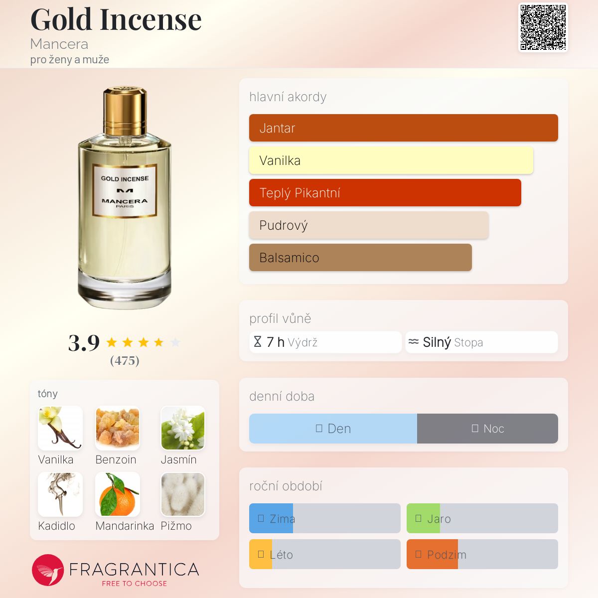 Gold Incense podle Mancera je Orientální Floral vůně pro ženy a muže. Gold Incense byl/a uveden/a v roce 2018. "Nosem" za touto vůní je Pierre Montale. Vrchní tóny jsou Kadidlo, Mandarinka, Káva a Růžový pepř; střední tóny jsouJasmín, Fialka, List pačuli a Růže ; základní tóny jsou Vanilkový lusk, Benzoin a Bílé pižmo.