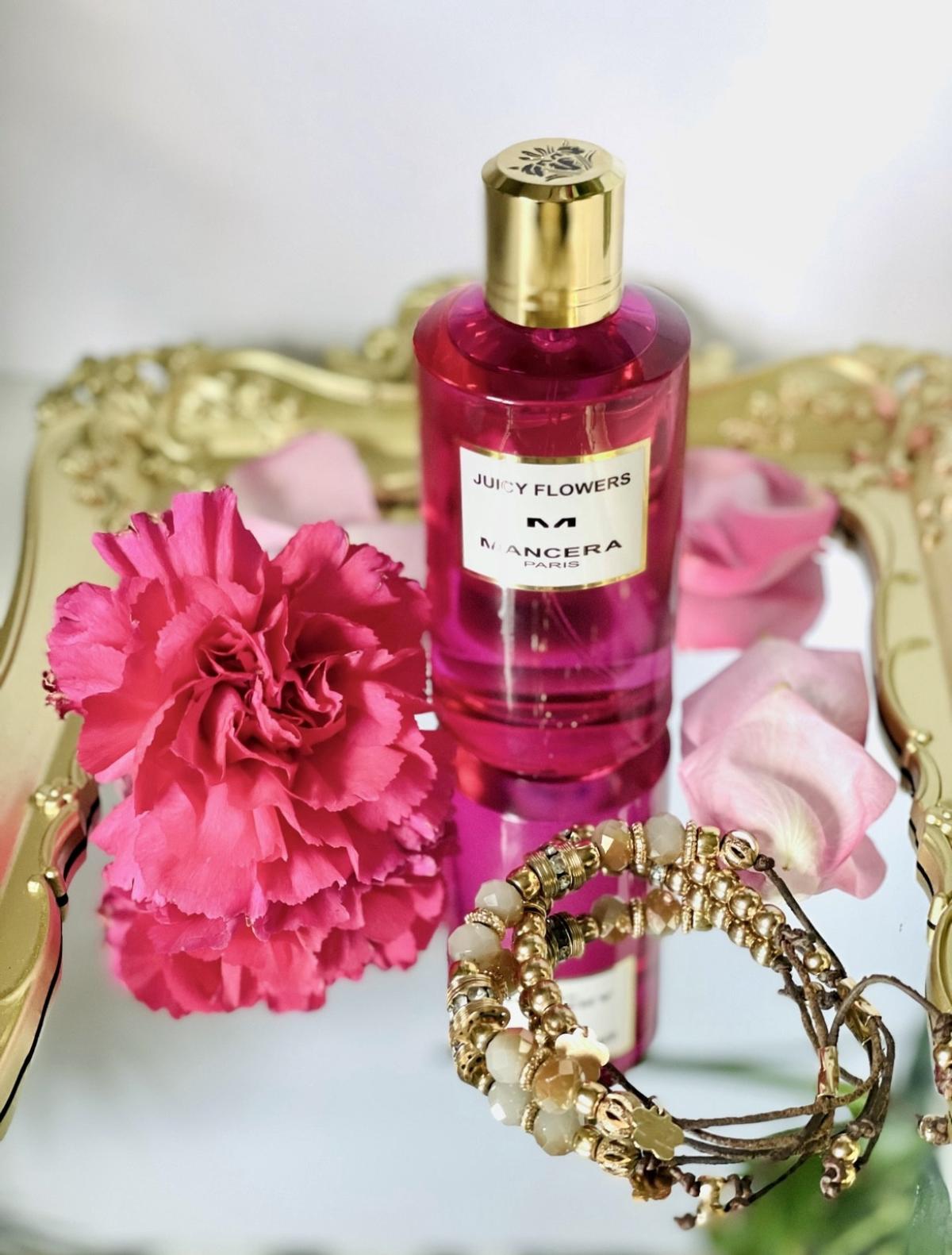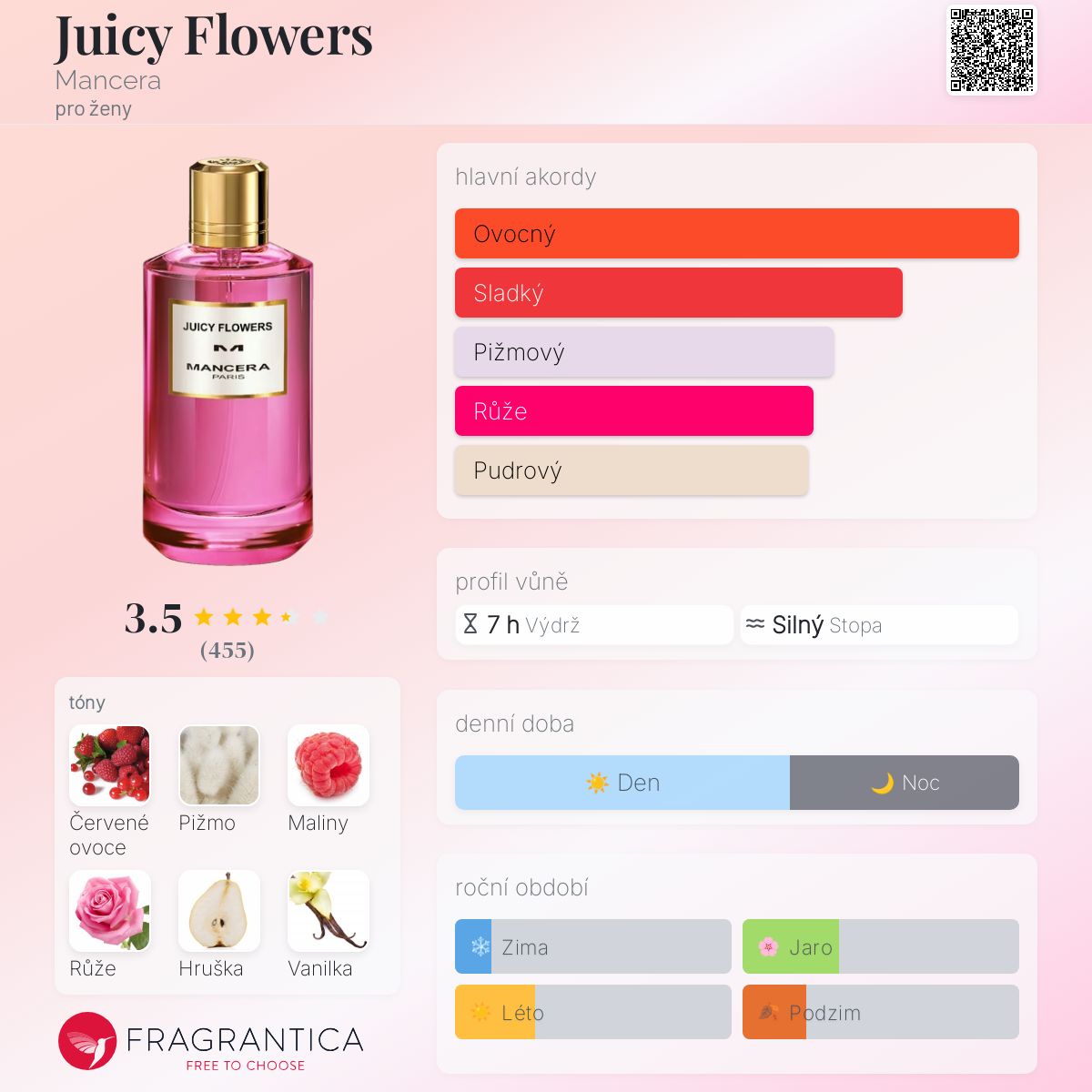 Juicy Flowers podle Mancera je Floral Fruity vůně pro ženy. Juicy Flowers byl/a uveden/a v roce 2020. "Nosem" za touto vůní je Pierre Montale. Vrchní tóny jsou Červené ovoce, Hruška, Růžový pepř a Citrusy; střední tóny jsouRůže, Broskev, Jasmín a Santalové dřevo ; základní tóny jsou Bílé pižmo, Maliny, Vanilka a Ambra.