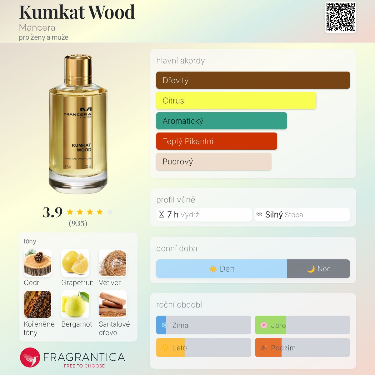 Kumkat Wood podle Mancera je Woody Floral Musk vůně pro ženy a muže. Kumkat Wood byl/a uveden/a v roce 2013. "Nosem" za touto vůní je Pierre Montale. Vrchní tóny jsou Grapefruit, Koření a Bergamot; střední tóny jsouKvětinové tóny, Pačuli a Jantar (ambra) ; základní tóny jsou Cedr, Vetiver, Santalové dřevo a Bílé pižmo.