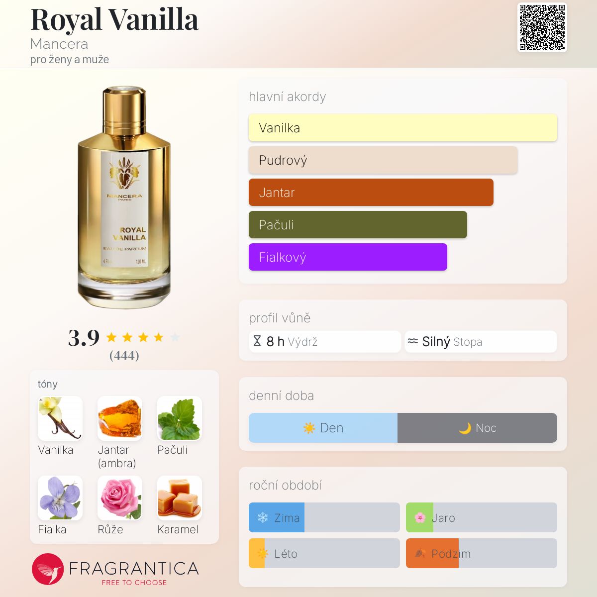 Royal Vanilla podle Mancera je Orientální Woody vůně pro ženy a muže. Royal Vanilla byl/a uveden/a v roce 2019. "Nosem" za touto vůní je Pierre Montale. Vrchní tóny jsou Růžová voda, Růže, List rebarbory a Citrusy; střední tóny jsouFialka, Okvětní lístky růží, Karamel a Pomerančový květ ; základní tóny jsou Vanilka, Jantar (ambra), List pačuli a Bílé pižmo.
