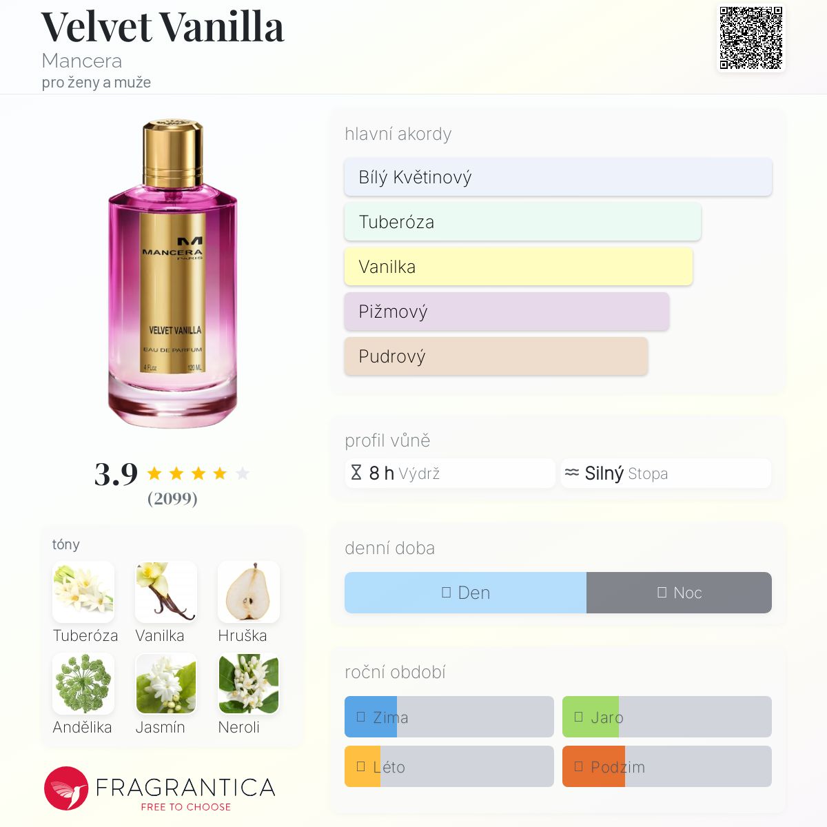 V poslední době jsem si koupila několik parfémů mancera a montale naslepo, no čekala jsem něco exkluzivnějšího a zdají se mi dobré parfémy, ale velmi přeceňované, zatím obecné shrnutí, napsala jsem několik recenzí na ostatní, které jsem si koupila, teď s ohledem na sametovou vanilku, myslím, že je to unisex parfém a extrémně sladký, voní po tuberóze přehnaným způsobem, Rico ano, ale trochu to přehnali, ve svém výstupu je to cukrová bomba, dost zahalující až zdrcující, je to kytice bílých květů velmi intenzivní, první hodinu vás schová jako vlněná deka uprostřed léta.... udělá přechod od zahlcení k smrti k usazení na kůži a lehkému provonění, pak se začnou objevovat další nuance trochu umělé a ploché, například vůně nové panenky s nádechem ovocného šoku... nezabíjí mě, ani mě nepřivádí k šílenství, ale nastříkala jsem ji na svého 74letého otce a na jeho kůži se hodně mění, nastříkala jsem ji na svého 38letého manžela a je to opravdu efektní,,,, jsou to věci vůně, kůže, nechám to na nich, ať ji používají a já si ji tak užiju; nedoporučuji ji kupovat naslepo, i když o ní všichni mluví zázraky....
