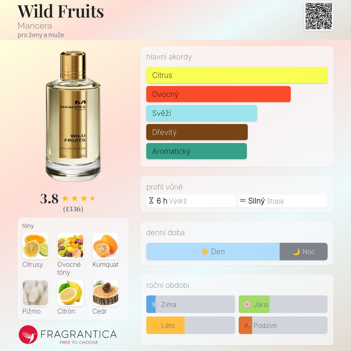 Wild Fruits podle Mancera je Floral Fruity vůně pro ženy a muže. Wild Fruits byl/a uveden/a v roce 2011. "Nosem" za touto vůní je Pierre Montale. Vrchní tóny jsou Citrusy, Kumquat, Citrón a Grapefruit; střední tóny jsouOvocné tóny, Černý rybíz, Broskev, Jablko a Fialka ; základní tóny jsou Bílé pižmo a Cedr.