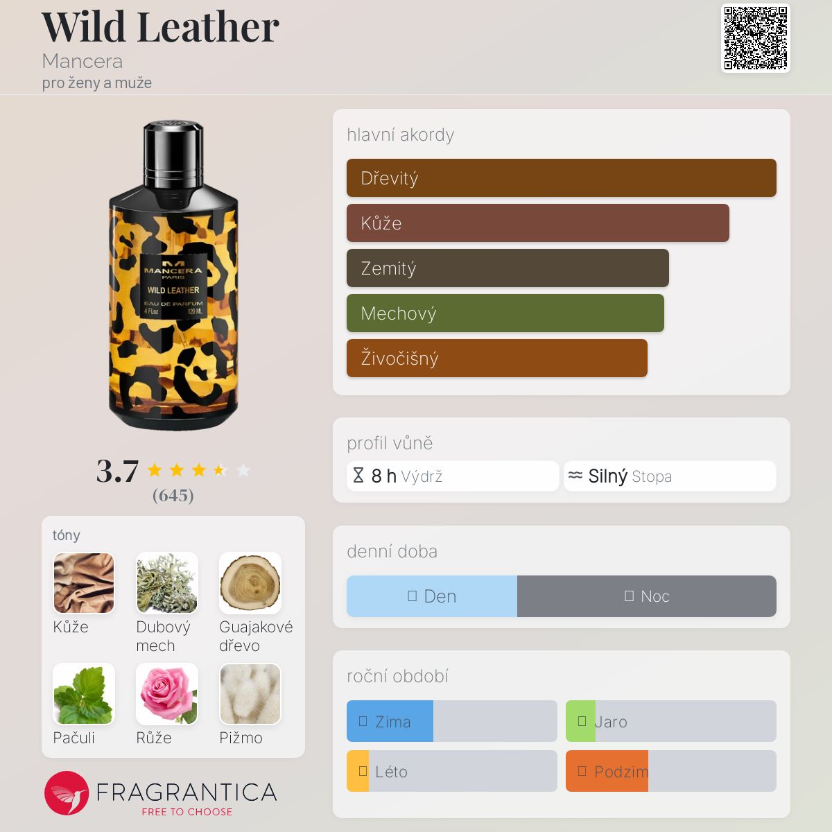 Wild Leather podle Mancera je Leather vůně pro ženy a muže. Wild Leather byl/a uveden/a v roce 2014. "Nosem" za touto vůní je Pierre Montale. Vrchní tón je Sicilský bergamot ; střední tóny jsouPačuli, Bulharská růže a Fialka ; základní tóny jsou Kůže, Dubový mech, Guajakové dřevo, Bílé pižmo a Jantar (ambra).