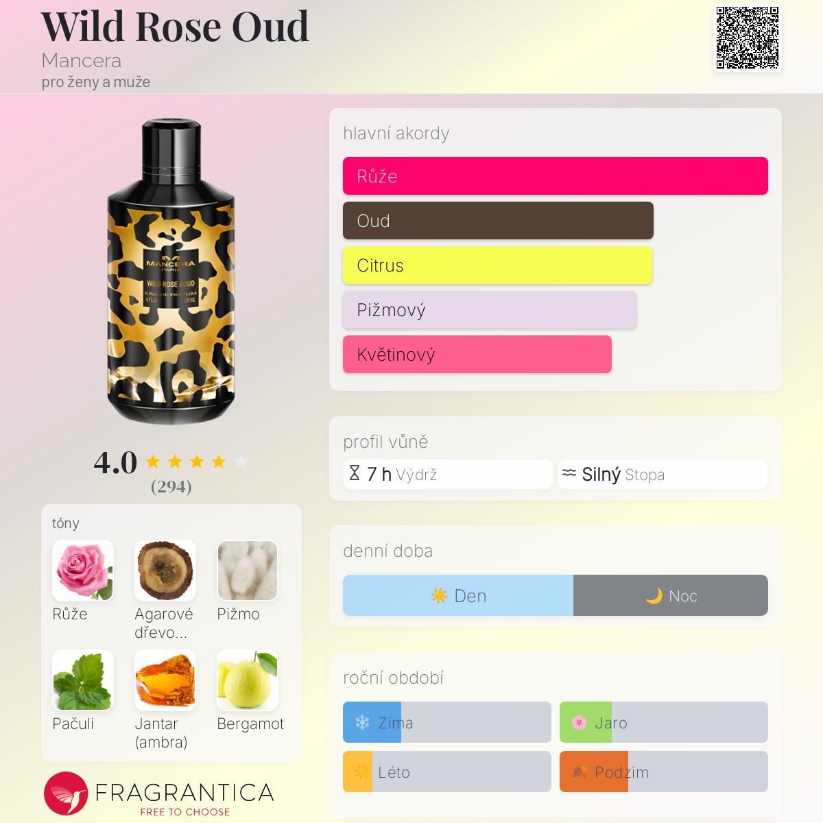 Wild Rose Oud podle Mancera je Chypre Floral vůně pro ženy a muže. Wild Rose Oud byl/a uveden/a v roce 2014. "Nosem" za touto vůní je Pierre Montale. Vrchní tóny jsou Bergamot a Citrón; střední tóny jsouTurecká červená růže, Pačuli a Egyptský jasmín ; základní tóny jsou Agarové dřevo (oud), Pižmo, Jantar (ambra) a Vanilkový lusk.