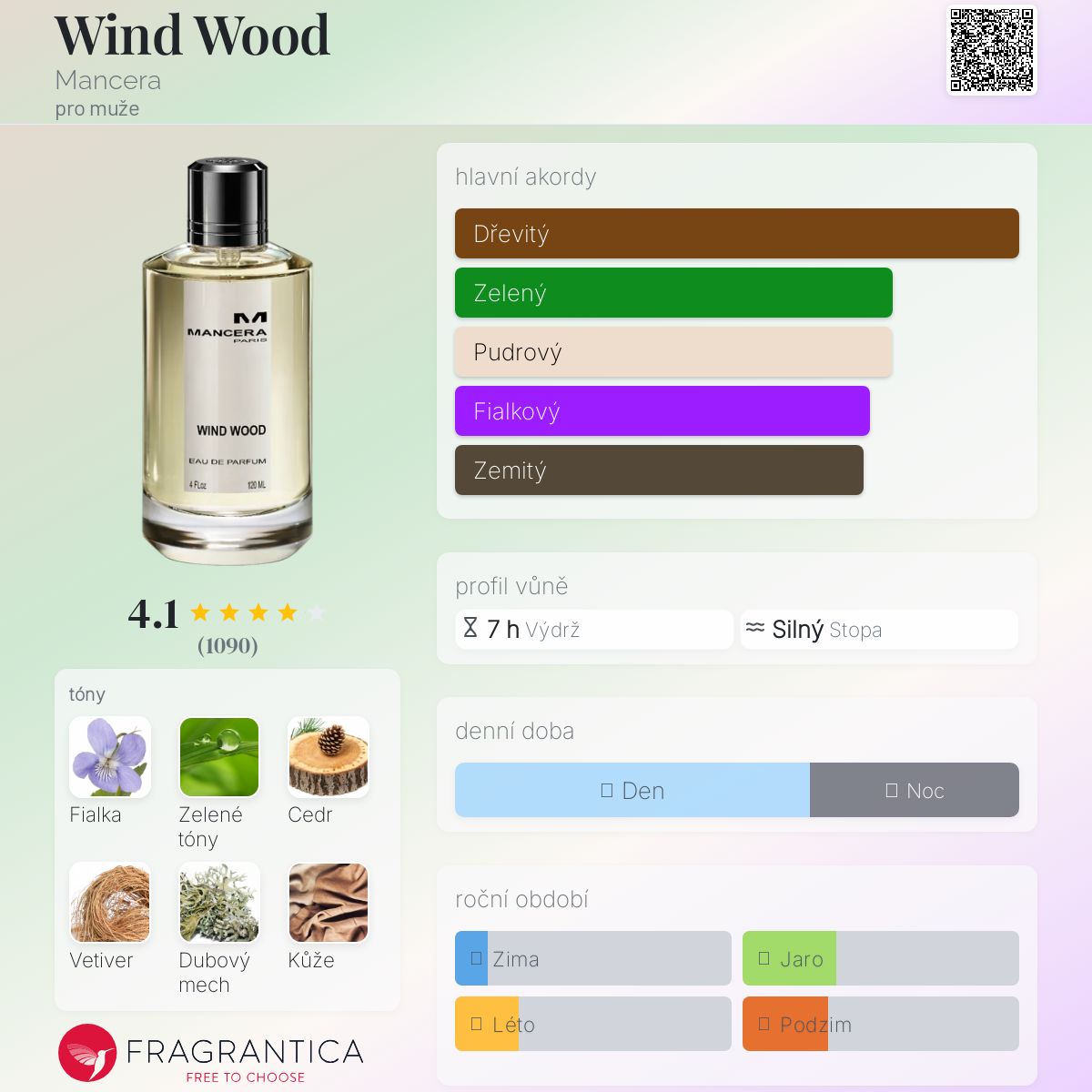 Wind Wood podle Mancera je Leather vůně pro muže. Wind Wood byl/a uveden/a v roce 2014. "Nosem" za touto vůní je Pierre Montale. Vrchní tóny jsou Zelené tóny, Mandarinka a Růžový pepř; střední tóny jsouFialka a Pačuli ; základní tóny jsou Cedr, Vetiver, Dubový mech, Kůže, Bílé pižmo a Jantar (ambra).