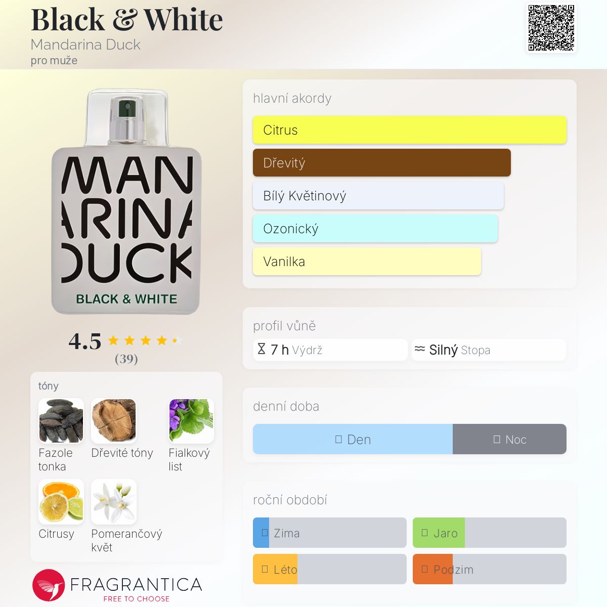 Black & White podle Mandarina Duck je Woody Aromatic vůně pro muže. Black & White byl/a uveden/a v roce 2016. Vrchní tóny jsou Fialkový list a Citrusy; střední tóny jsouFazole tonka a Pomerančový květ ; základní tón je Dřevité tóny.