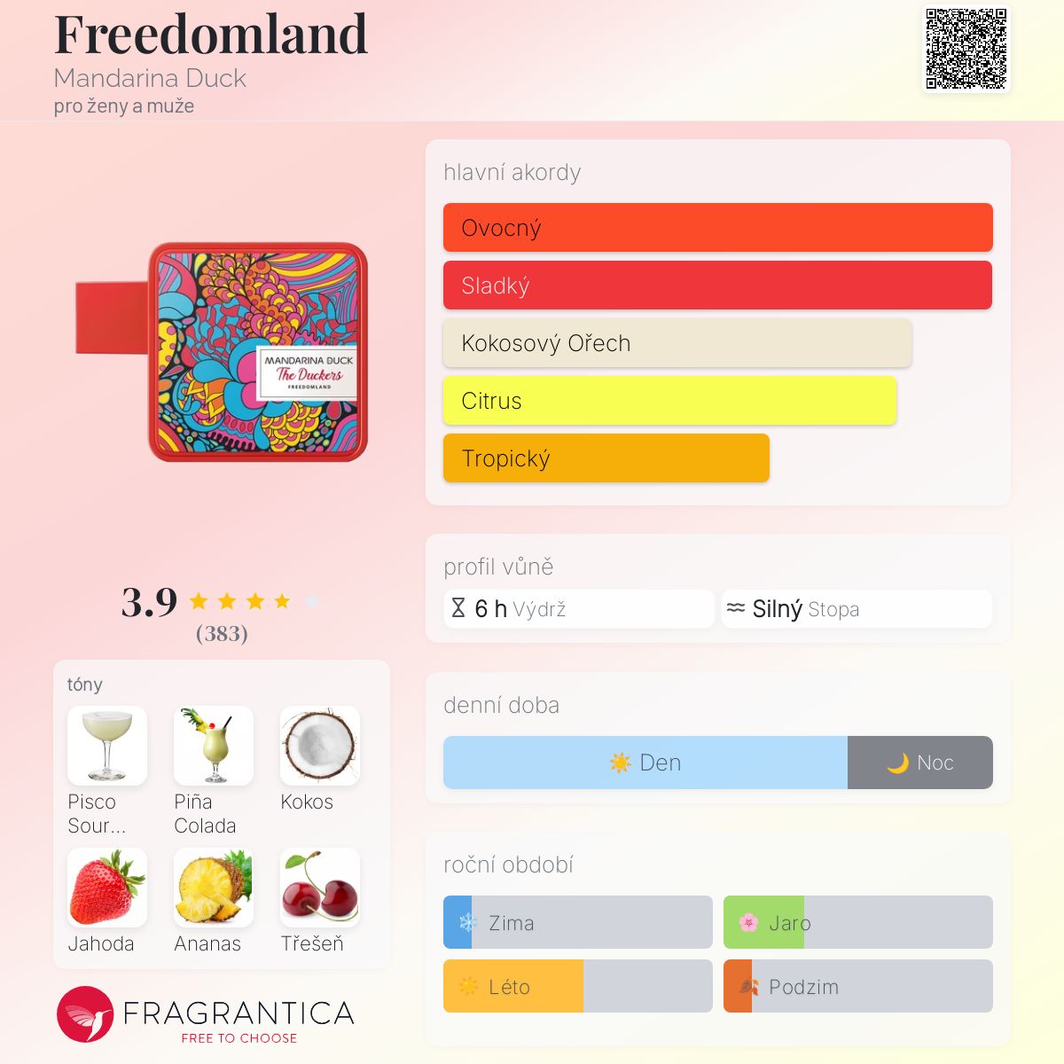 Freedomland podle Mandarina Duck je Floral Fruity vůně pro ženy a muže. Freedomland byl/a uveden/a v roce 2020. "Nosem" za touto vůní je Carine Boin. Vrchní tóny jsou Jahoda, Ananas, Máta, Brazilský pomeranč, Bazalka a Italský citrón; střední tóny jsouPiña Colada, Kokosové mléko, Liči a Jasmín ; základní tóny jsou Pisco Sour koktejl, Třešeň, Pižmo a Otočník.