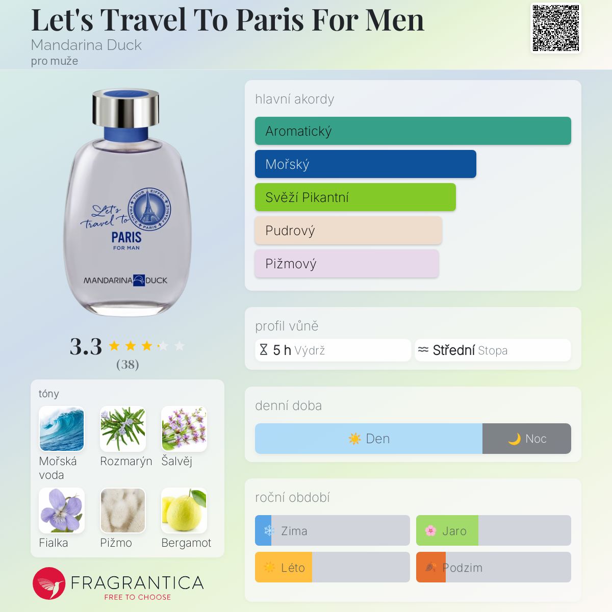 Let's Travel To Paris For Men podle Mandarina Duck je Aromatic Fougere vůně pro muže. Let's Travel To Paris For Men byl/a uveden/a v roce 2018. "Nosem" za touto vůní je Jean-Christophe Hérault. Vrchní tóny jsou Šalvěj, Bergamot a Jablko; střední tóny jsouMořské tóny, Rozmarýn a Fialka ; základní tóny jsou Pižmo, Mech a Fazole tonka.