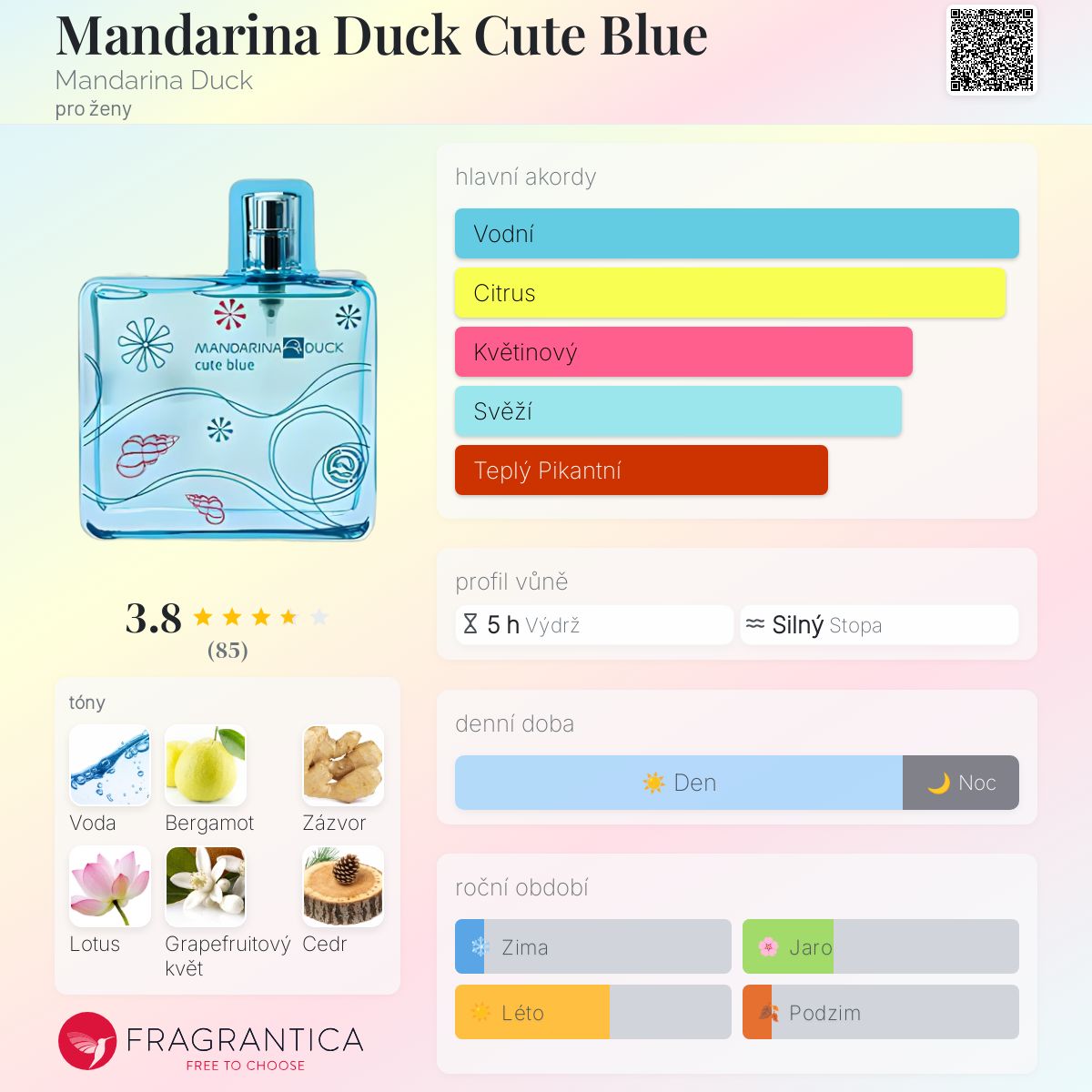 Mandarina Duck Cute Blue podle Mandarina Duck je Floral Aquatic vůně pro ženy. Mandarina Duck Cute Blue byl/a uveden/a v roce 2011. Vrchní tóny jsou Vodnaté tóny, Bergamot a Grapefruitový květ; střední tóny jsouZázvor, Modrý lotos a Magnólie ; základní tóny jsou Cedr, Bílé pižmo a Ambra.