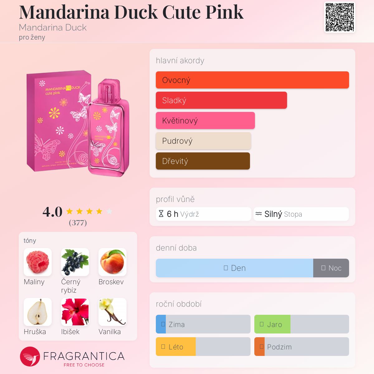 Mandarina Duck Cute Pink podle Mandarina Duck je Floral vůně pro ženy. Mandarina Duck Cute Pink byl/a uveden/a v roce 2007. Vrchní tóny jsou Maliny, Černý rybíz, Broskev a Hruška; střední tóny jsouIbišek, Vanilka, Lilie a Gardénie ; základní tóny jsou Pižmo a Santalové dřevo.