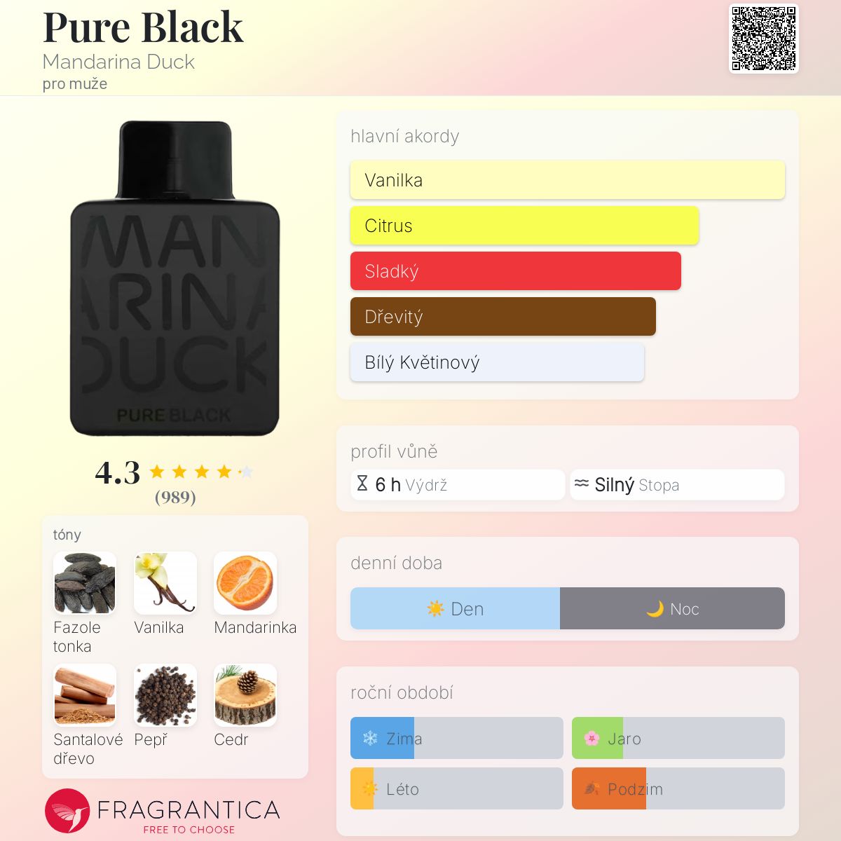 Pure Black podle Mandarina Duck je Woody Aromatic vůně pro muže. Pure Black byl/a uveden/a v roce 2009. "Nosem" za touto vůní je Nathalie Lorson. Vrchní tóny jsou Mandarinka, Pepř a Bergamot; střední tóny jsouFazole tonka, Květ tiare a Květ afrického pomeranče ; základní tóny jsou Vanilka, Santalové dřevo a Virginský cedr.