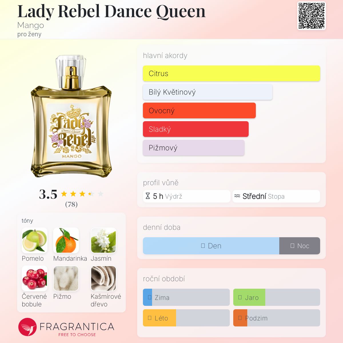 Lady Rebel Dance Queen podle Mango je Floral Fruity vůně pro ženy. Lady Rebel Dance Queen byl/a uveden/a v roce 2012. "Nosem" za touto vůní je Sonia Constant. Vrchní tóny jsou Pomelo, Mandarinka a Červené bobule; střední tóny jsouJasmín a Tuberóza ; základní tóny jsou Pižmo, Kašmírové dřevo a Pačuli.