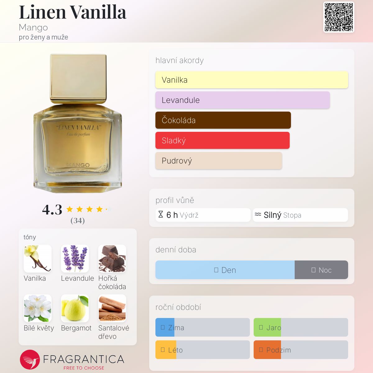 Linen Vanilla podle Mango je Woody Aromatic vůně pro ženy a muže. Toto je nová vůně. Linen Vanilla byl/a uveden/a v roce 2025. Vrchní tóny jsou Levandule a Bergamot; střední tóny jsouČokoláda a Bílé květy ; základní tóny jsou Vanilka a Santalové dřevo.