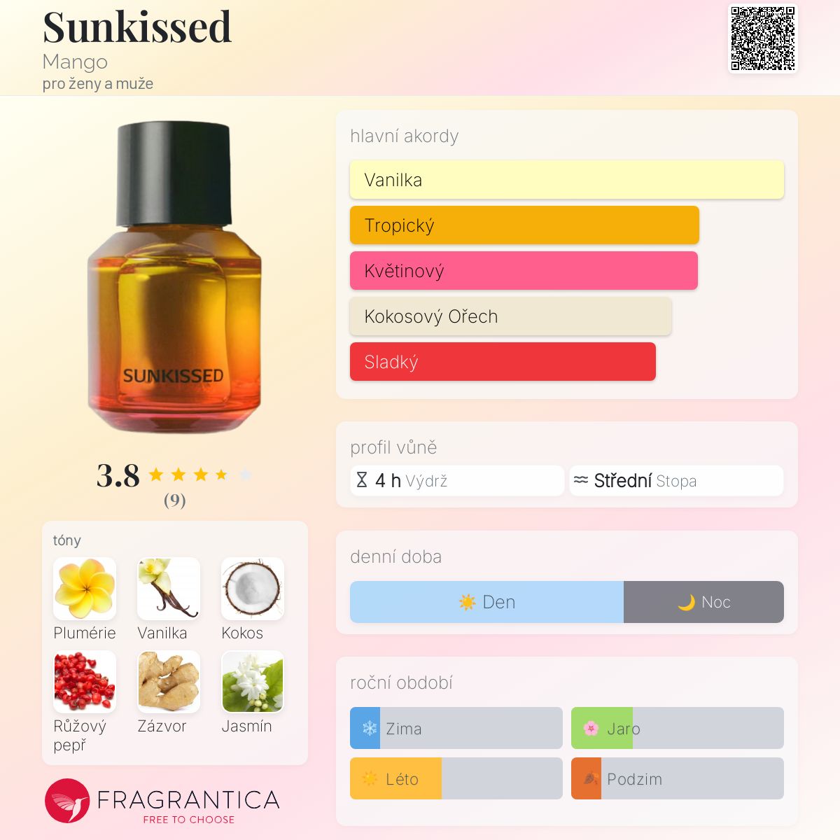 Sunkissed podle Mango je Floral Fruity Gourmand vůně pro ženy a muže. Toto je nová vůně. Sunkissed byl/a uveden/a v roce 2025. Vrchní tóny jsou Kokos, Růžový pepř a Zázvor; střední tóny jsouPlumérie a Jasmín ; základní tóny jsou Vanilka, Fazole tonka a Benzoin.