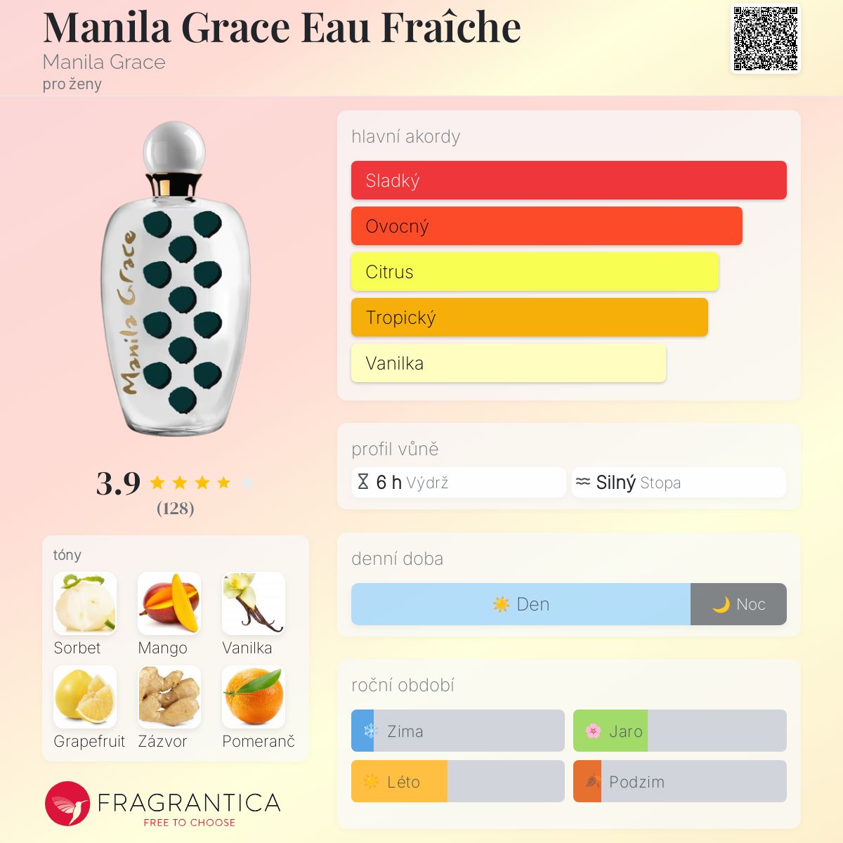 Manila Grace Eau Fraîche podle Manila Grace je Floral Fruity vůně pro ženy. Manila Grace Eau Fraîche byl/a uveden/a v roce 2016. Vrchní tóny jsou Grapefruit, Zázvor a Pomeranč; střední tóny jsouSorbet, Mango, Jasmín a Lilie ; základní tóny jsou Vanilka, Pižmo a Bílé dřevo.